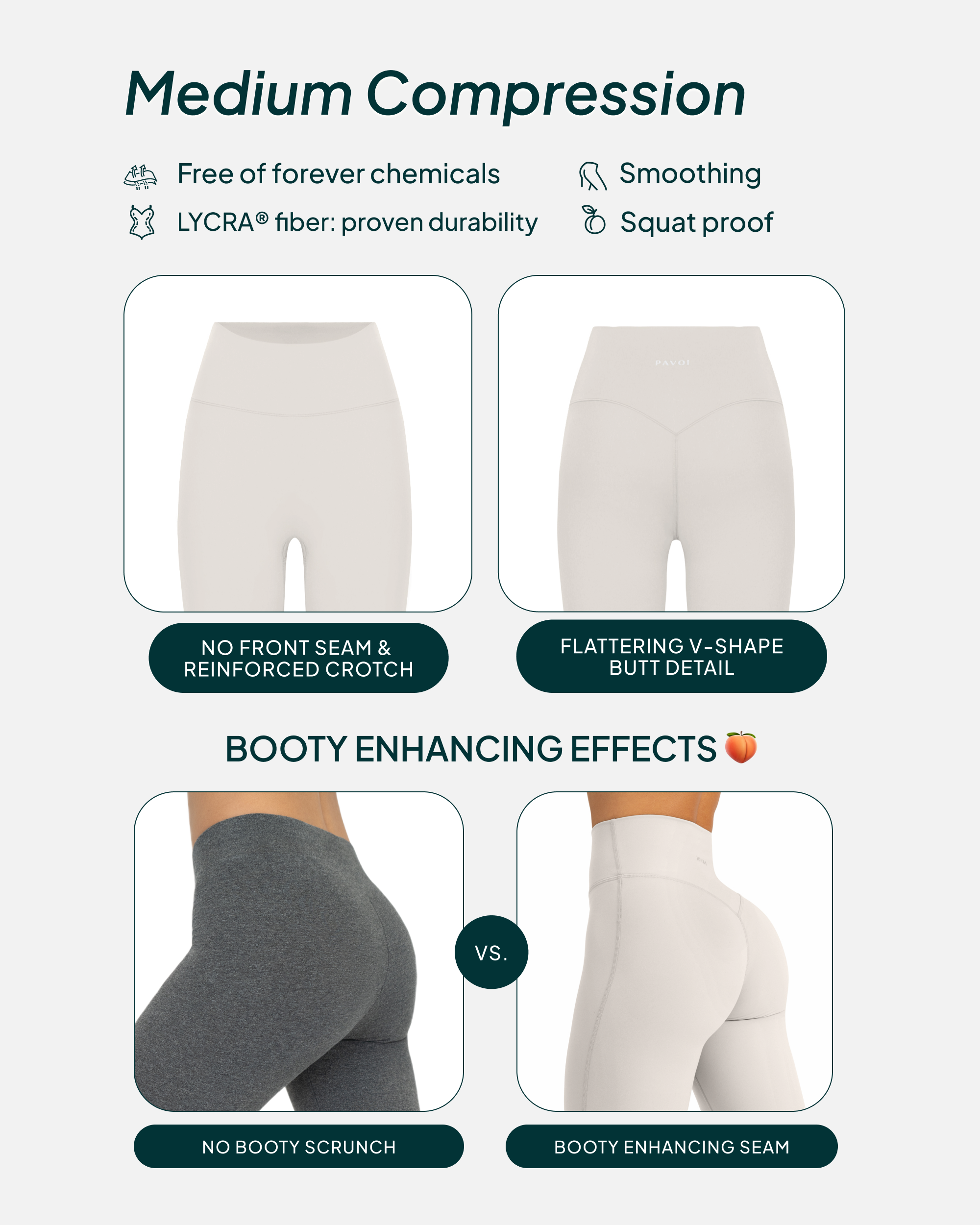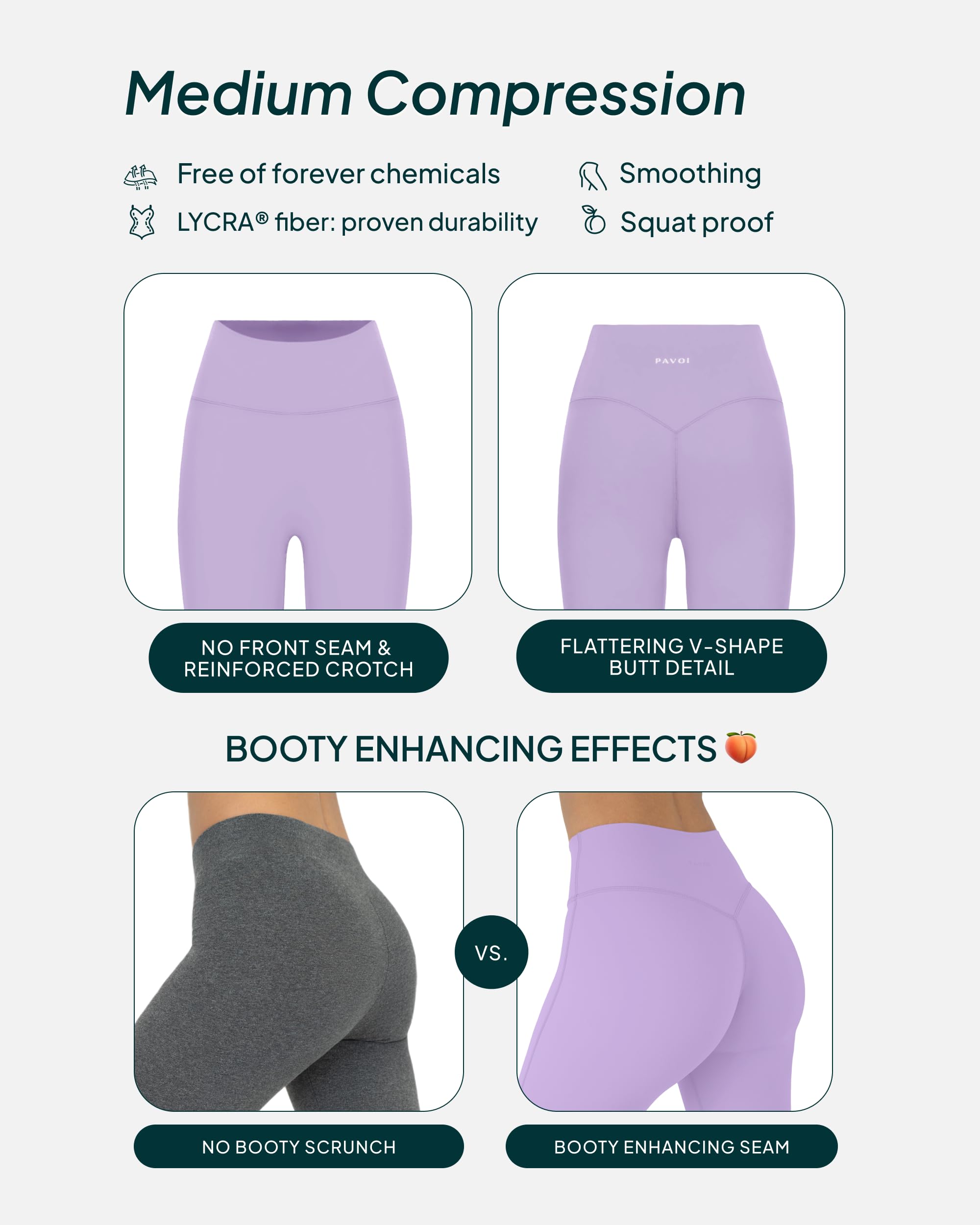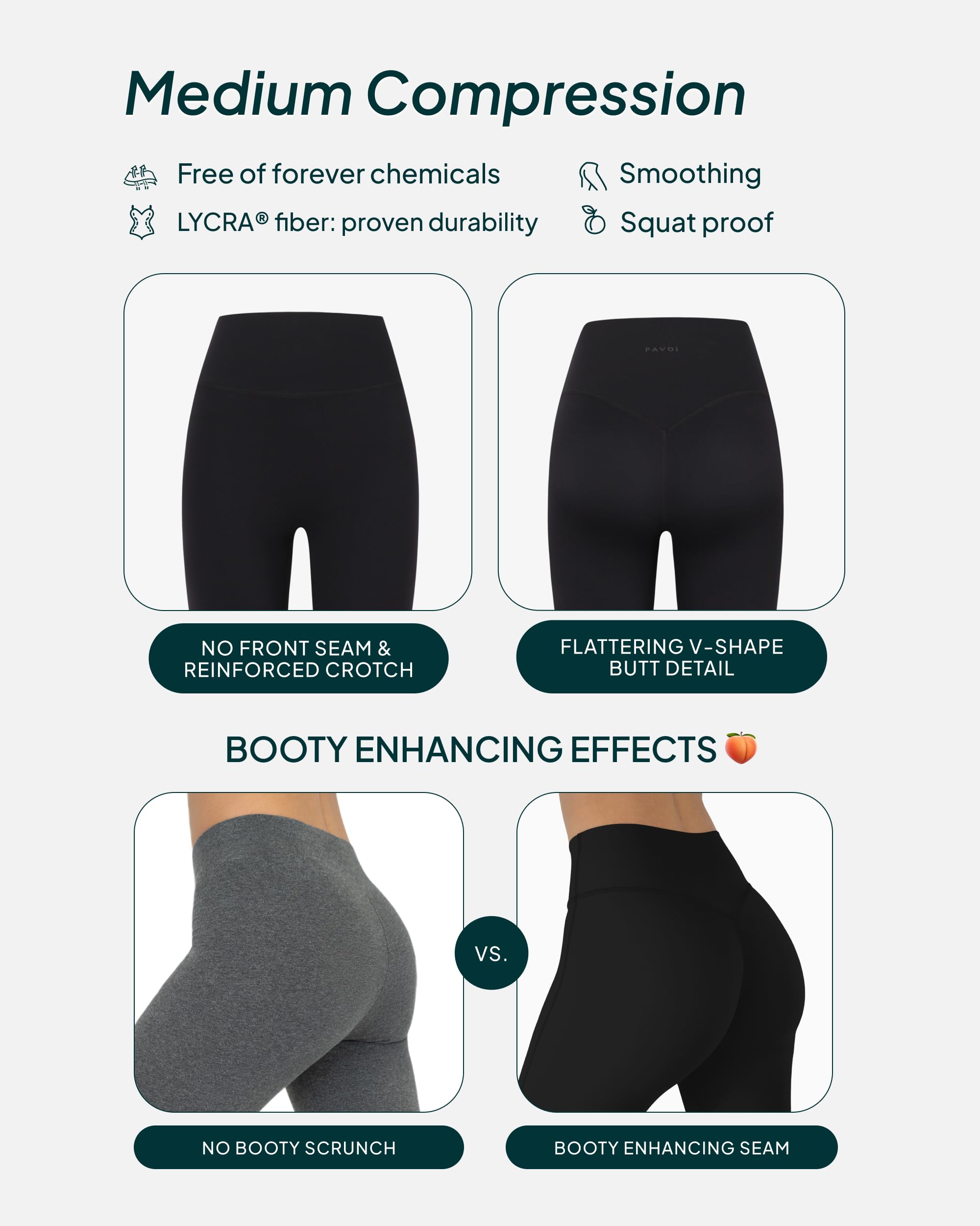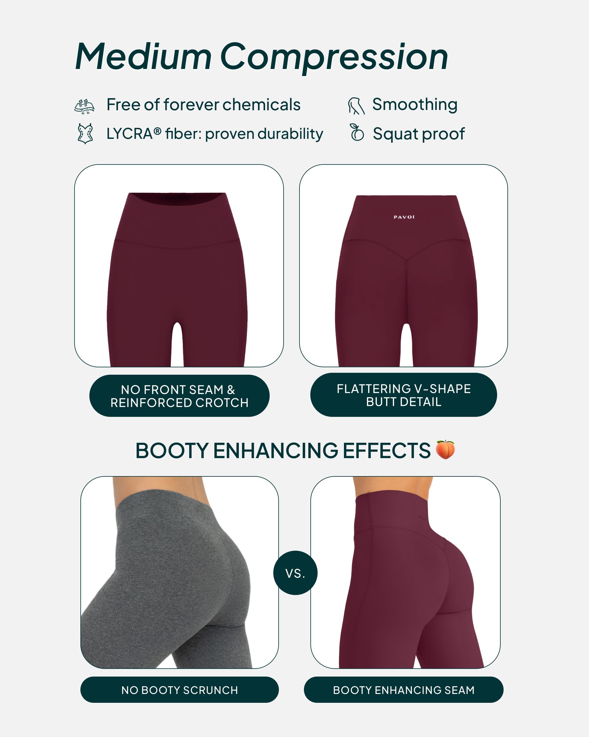 Get your steps in style in super-soft, smooth full-length leggings designed to give you a lift with flattering back detail. Features moisture-wicking fabric and high-waisted support for rest days, coffee walks, and your favorite yoga poses.FLEXFLOW COLLECTION: Athleisure staples for looking good and feeling good from yoga class to the coffee shop with ease and nonstop comfort.BODY HUGGING: A soft, comfy feel meets flattering support for light-impact activities and recovery days.FIT AND DESIGN: Flattering full-length leggings for extra lift and sculpting support during low-impact workout classes and rest days.ALL-DAY COMFORT: Comfortable high waistband and double-layered gusset for no camel toes or chafing.FEATURES: 27-28" inseams and squat-proof (not see-through!) dark colors for peace of mind at the gym.PREMIUM FABRICS: Active by PAVOI styles are made of PFA- and BPA-free silky-soft fabrics that never pill. 70% NYLON 30% LYCRA ®
