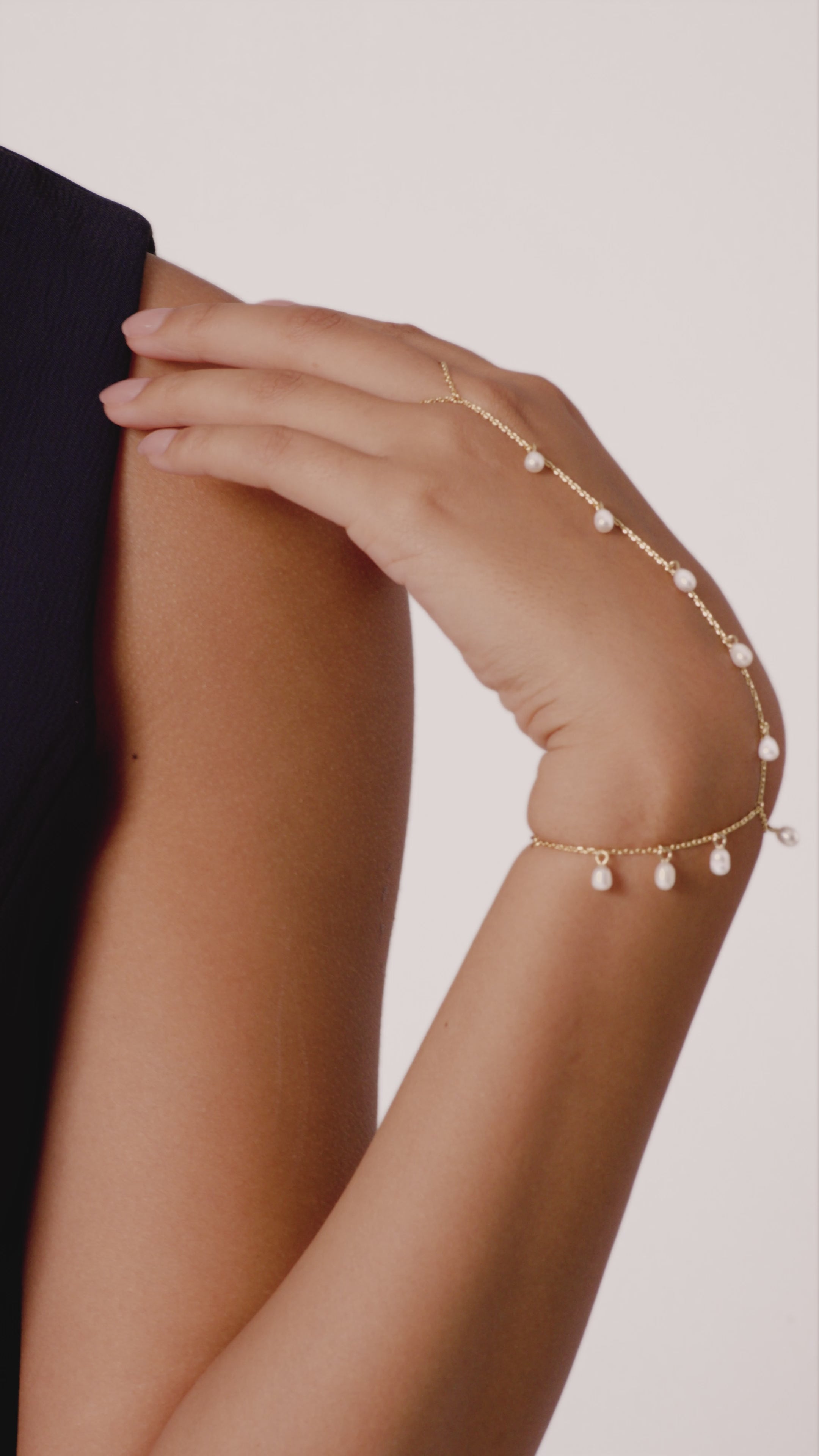 This dreamy hand chain blends boho charm with timeless pearl elegance. Designed as an elevated ring-and-bracelet combo, it shines with irregular freshwater pearls that flow effortlessly from wrist to finger.Details:- 14K yellow gold plated or rhodium plated.- Freshwater Pearls.- Measurements: Bracelet portion: 6"" + 2"" extender; and 1"" additional separate extender. Middle portion: 3""; Ring portion: 4.2"".- Pearls Size: 3mm x 4mm.- Hypoallergenic, cadmium-free, nickel-free and lead-free.