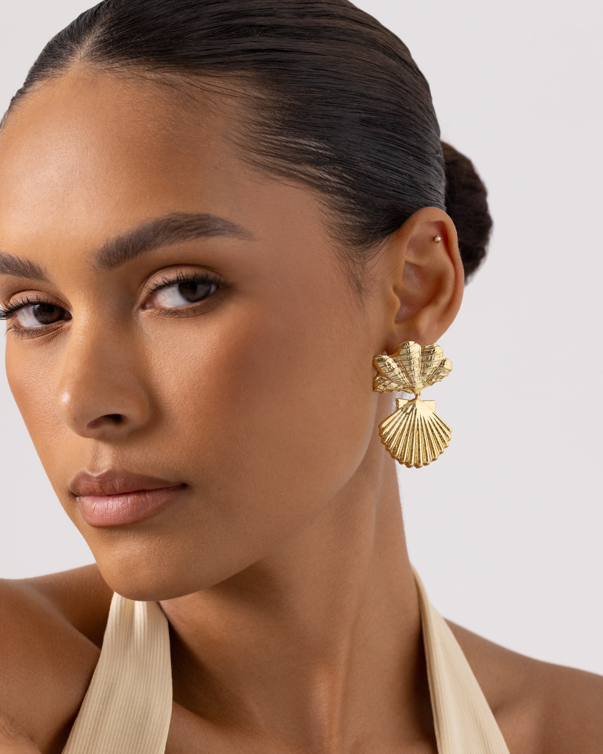 Bring the glow of the ocean to your everyday style with these seashell earrings, a stunning ode to summer, sunshine, and seaside elegance. These statement drop dangle earrings capture the beauty of the coast with a gold-plated finish and delicately detailed shell design, making them the ultimate beachy earrings for effortlessly chic, sun-soaked looks.