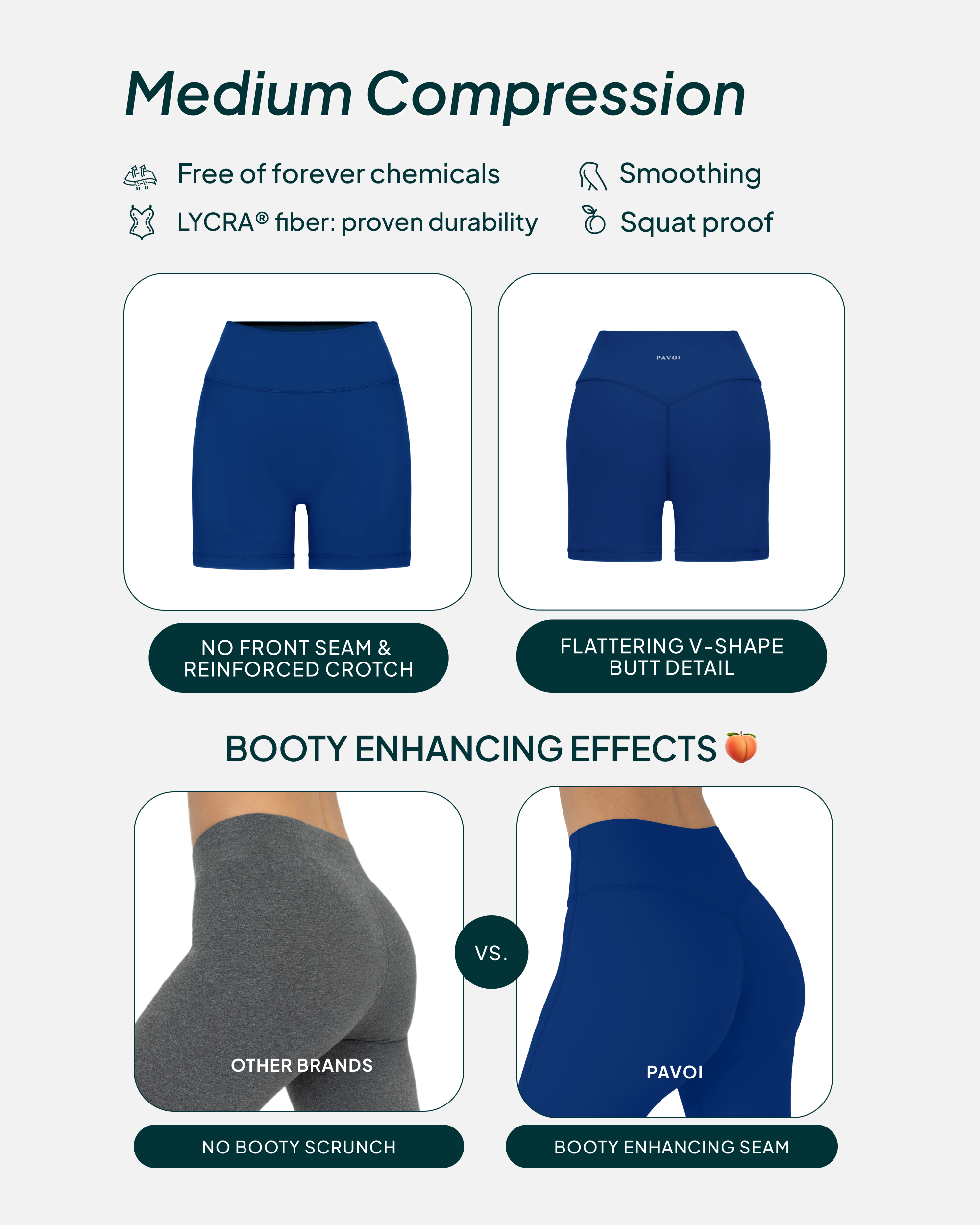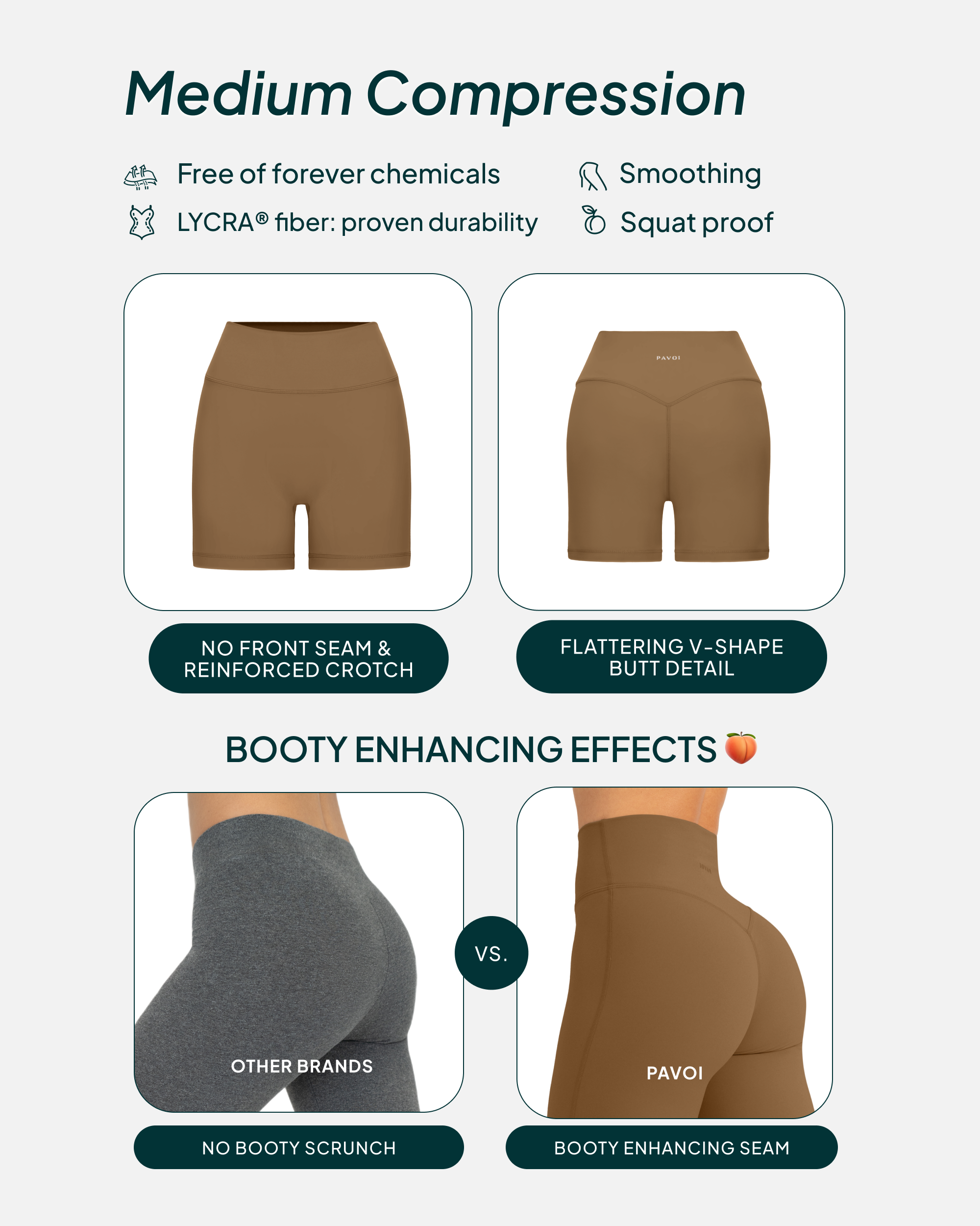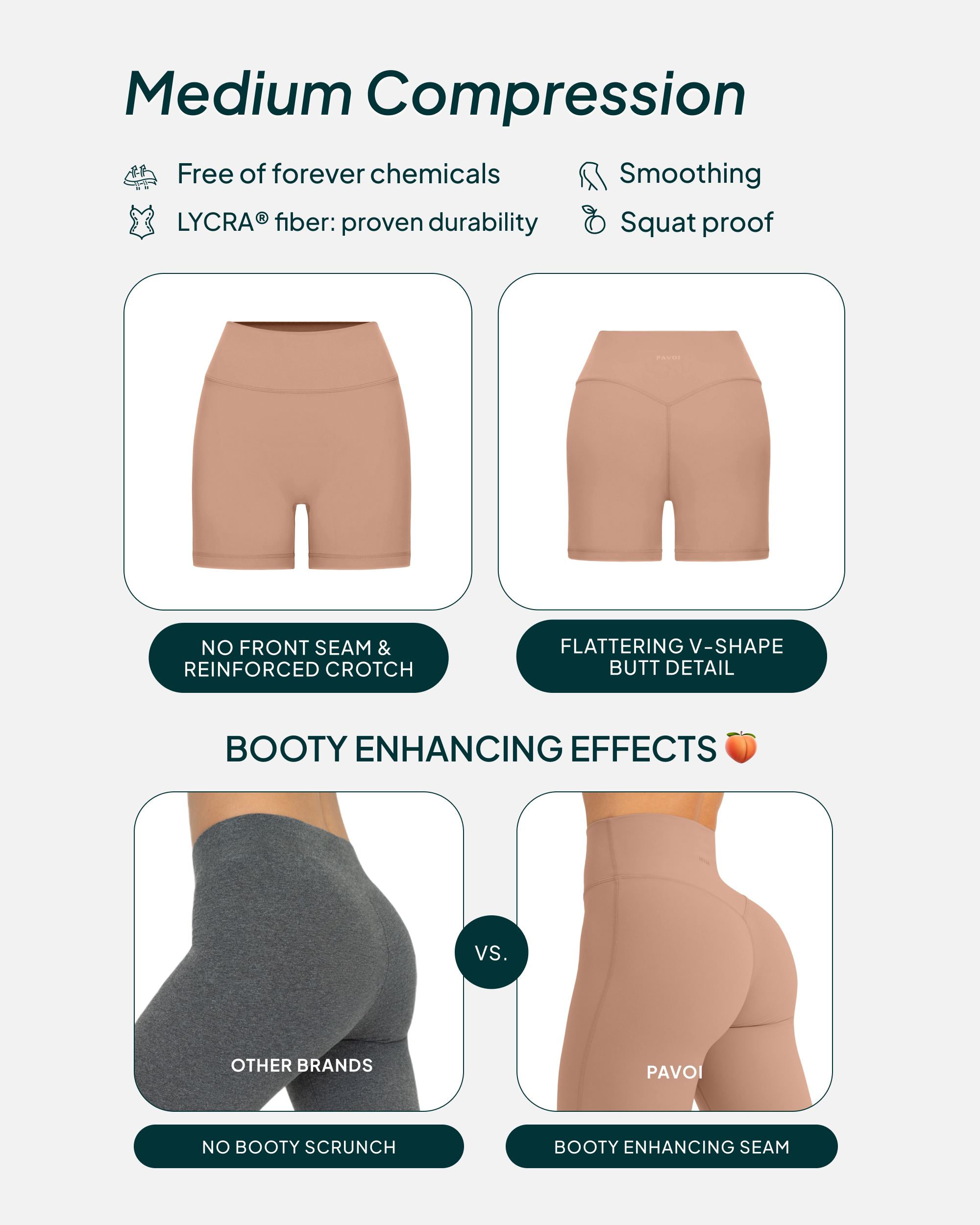 Biker shorts with the extra lift you need for hitting all your pilates moves and yoga poses with flattering back detail and a comfortable high waistband. Features soft, breathable fabric with medium coverage and a 4" inseam that hits the upper thigh.FLEXFLOW COLLECTION: Athleisure staples for looking good and feeling good from yoga class to the coffee shop with ease and nonstop comfort.BODY HUGGING: A soft, comfy feel meets flattering support for light-impact activities and recovery days.FIT AND DESIGN: Flattering butt-lifting biker shorts for extra lift and sculpting support during low-impact workout classes, rest days, and yoga.ALL-DAY COMFORT: Comfortable high waistband and double-layered gusset for no camel toes or chafing.FEATURES: 4" upper mid-thigh inseam and squat-proof (not see-through!) dark colors for peace of mind at the gym.PREMIUM FABRICS: Active by PAVOI styles are made of PFA- and BPA-free silky-soft fabrics that never pill. 70% NYLON 30% LYCRA®