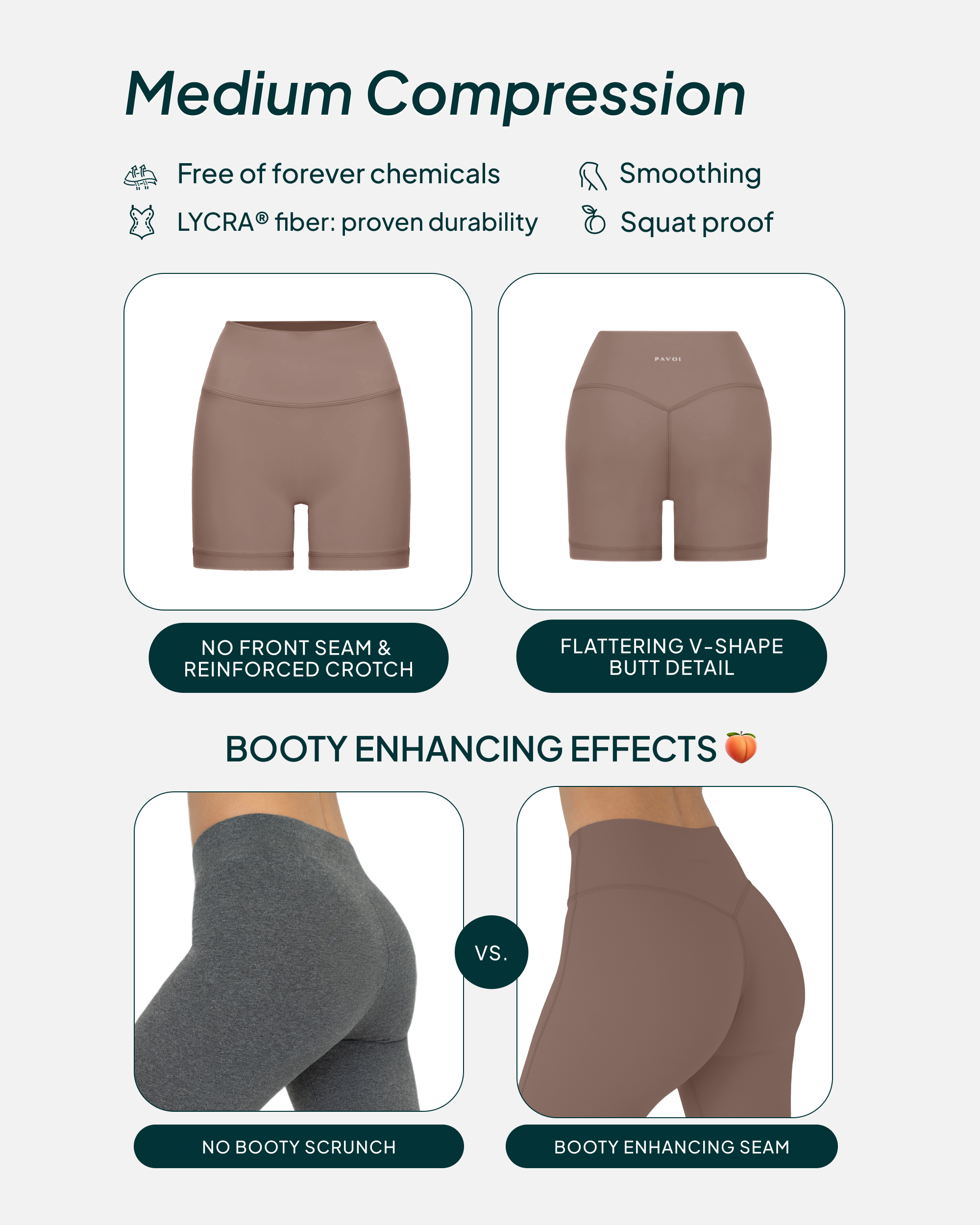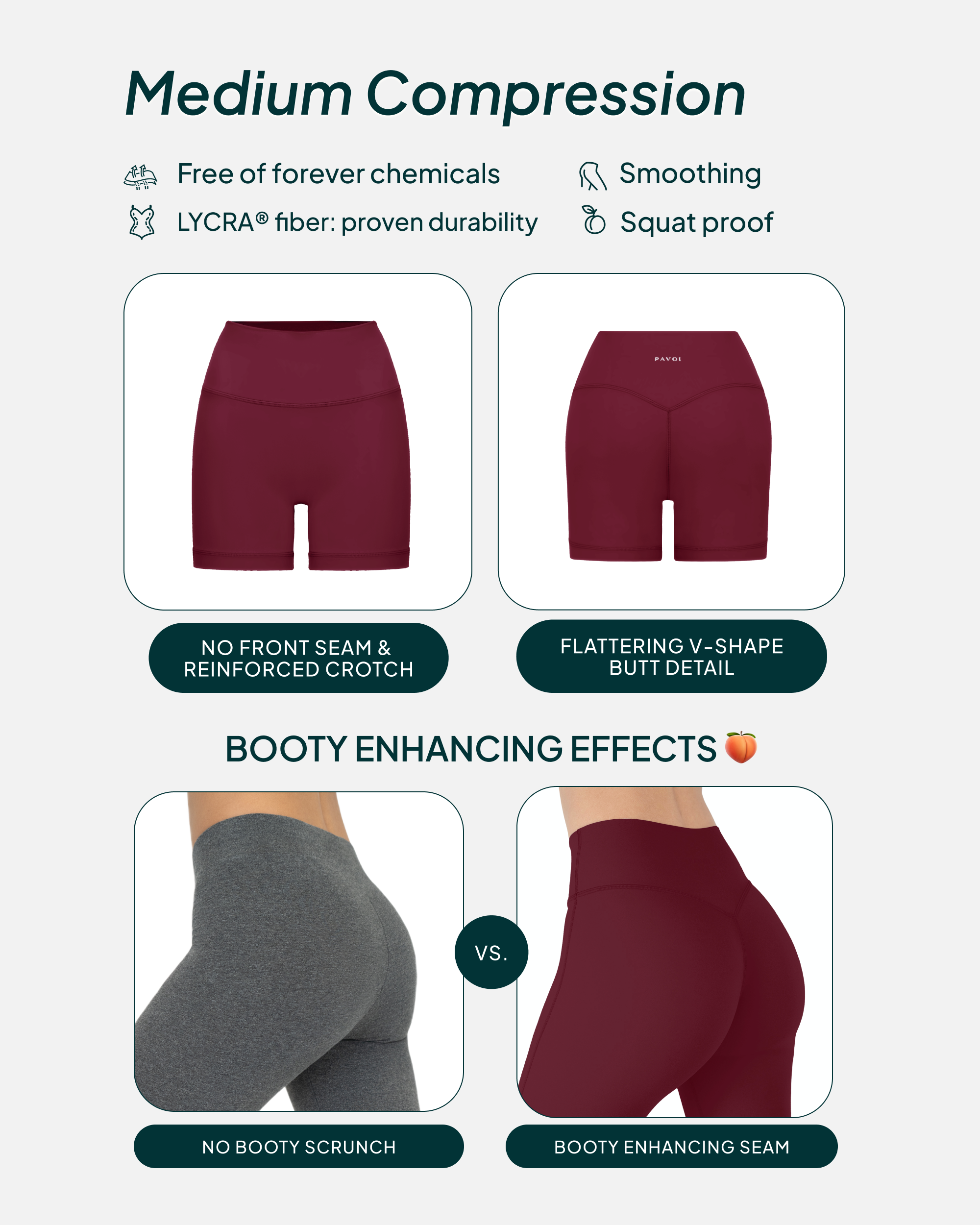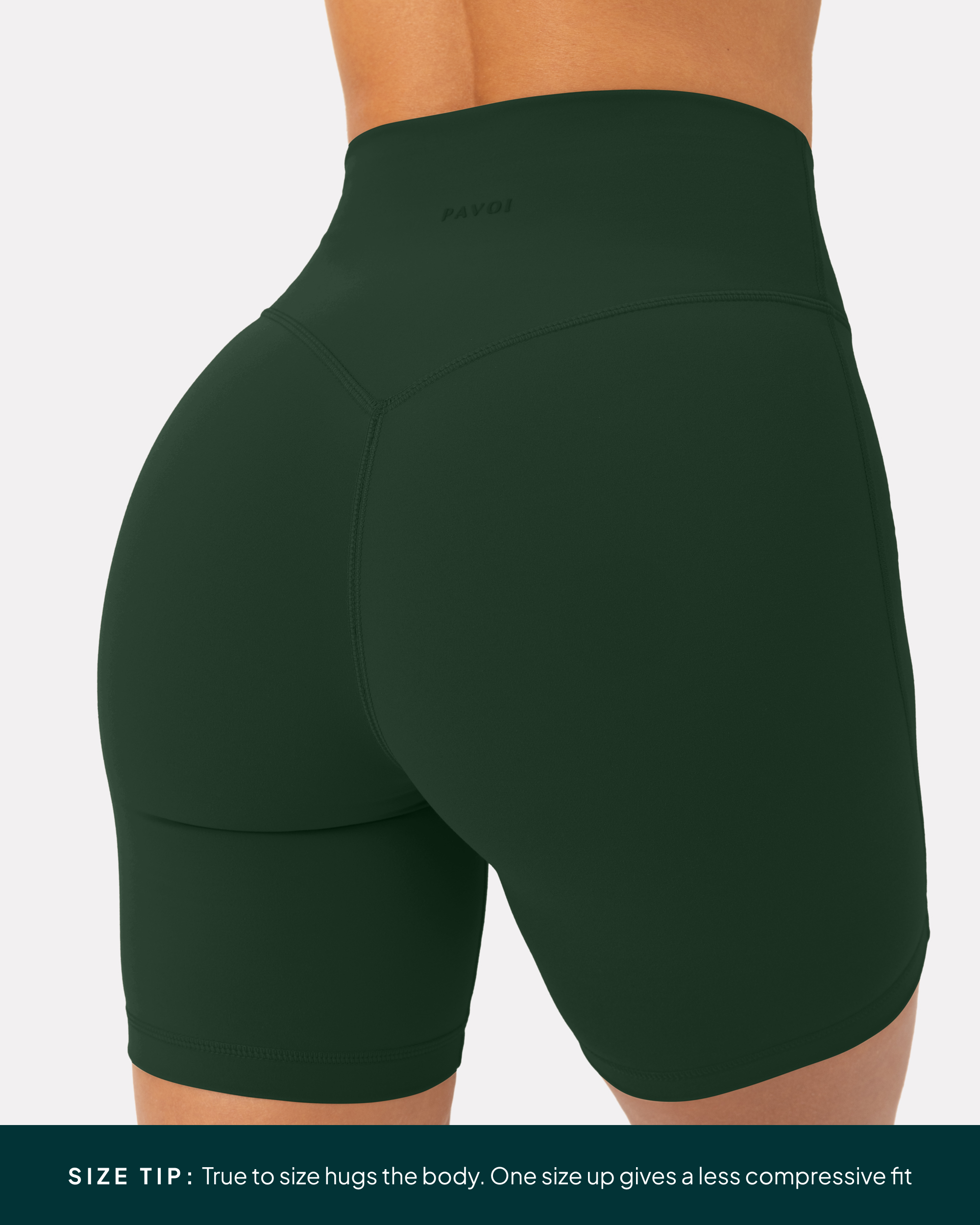 Biker shorts with the extra lift you need for hitting all your pilates moves and yoga poses with flattering back detail and a comfortable high waistband. Features soft, breathable fabric with medium coverage and a 6" inseam that hits mid thigh.FLEXFLOW COLLECTION: Athleisure staples for looking good and feeling good from yoga class to the coffee shop with ease and nonstop comfort.BODY HUGGING: A soft, comfy feel meets flattering support for light-impact activities and recovery days.FIT AND DESIGN: Flattering butt-lifting biker shorts for extra lift and sculpting support during low-impact workout classes, rest days, and yoga.ALL-DAY COMFORT: Comfortable high waistband and double-layered gusset for no camel toes or chafing.FEATURES: 6" mid-thigh inseam and squat-proof (not see-through!) dark colors for peace of mind at the gym.PREMIUM FABRICS: Active by PAVOI styles are made of PFA- and BPA-free silky-soft fabrics that never pill. 70% NYLON 30% LYCRA ®
