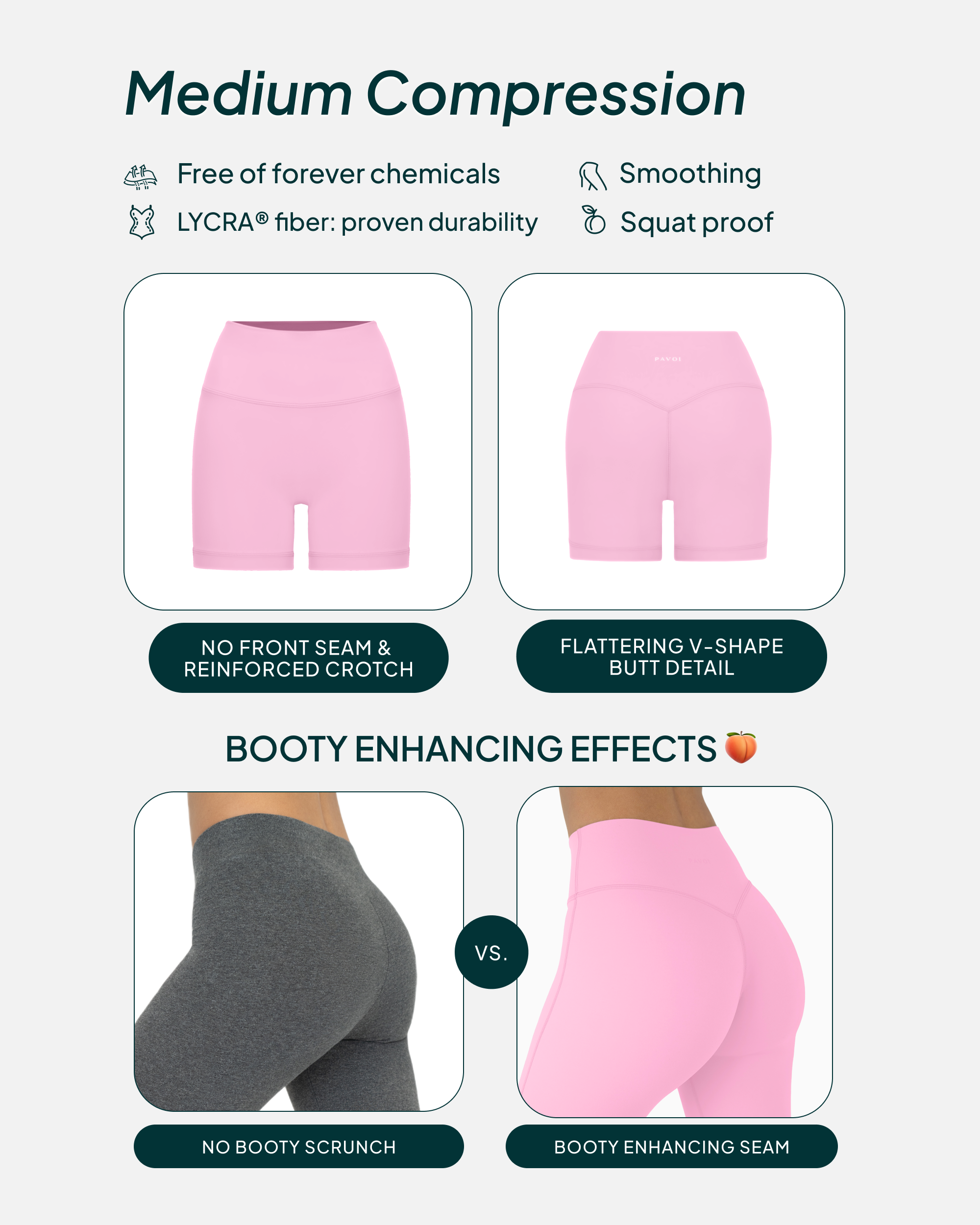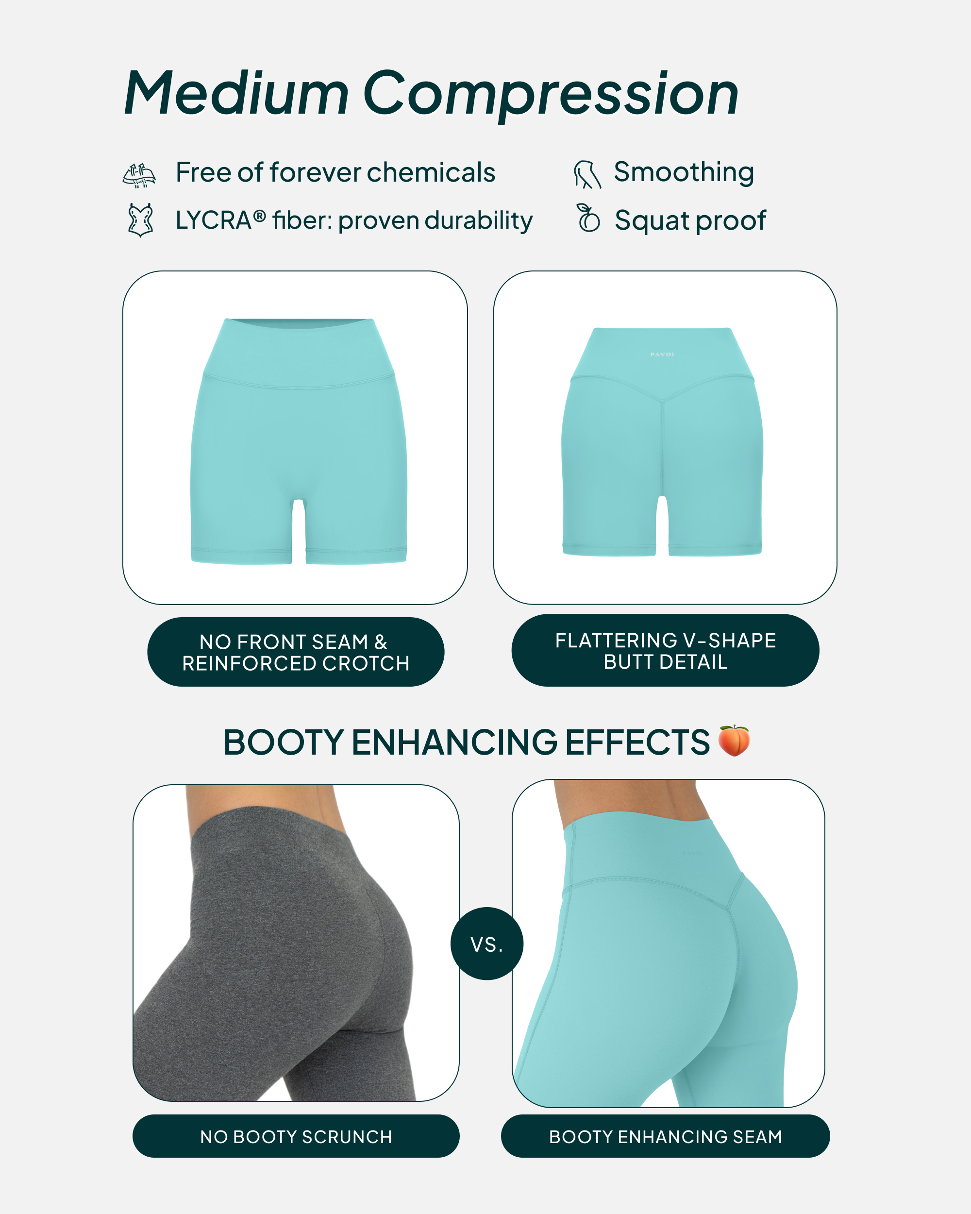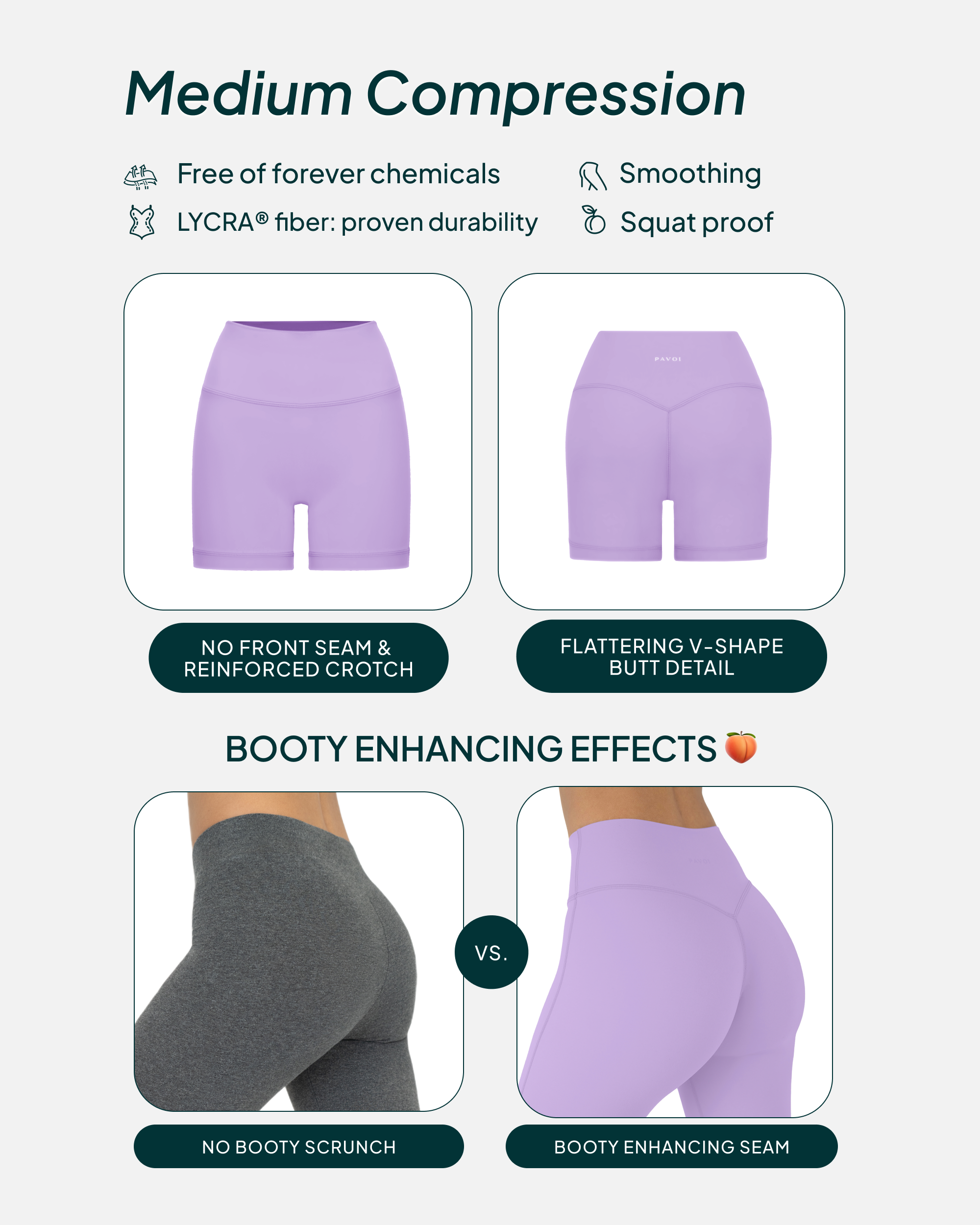 Biker shorts with the extra lift you need for hitting all your pilates moves and yoga poses with flattering back detail and a comfortable high waistband. Features soft, breathable fabric with medium coverage and a 6" inseam that hits mid thigh.FLEXFLOW COLLECTION: Athleisure staples for looking good and feeling good from yoga class to the coffee shop with ease and nonstop comfort.BODY HUGGING: A soft, comfy feel meets flattering support for light-impact activities and recovery days.FIT AND DESIGN: Flattering butt-lifting biker shorts for extra lift and sculpting support during low-impact workout classes, rest days, and yoga.ALL-DAY COMFORT: Comfortable high waistband and double-layered gusset for no camel toes or chafing.FEATURES: 6" mid-thigh inseam and squat-proof (not see-through!) dark colors for peace of mind at the gym.PREMIUM FABRICS: Active by PAVOI styles are made of PFA- and BPA-free silky-soft fabrics that never pill. 70% NYLON 30% LYCRA ®