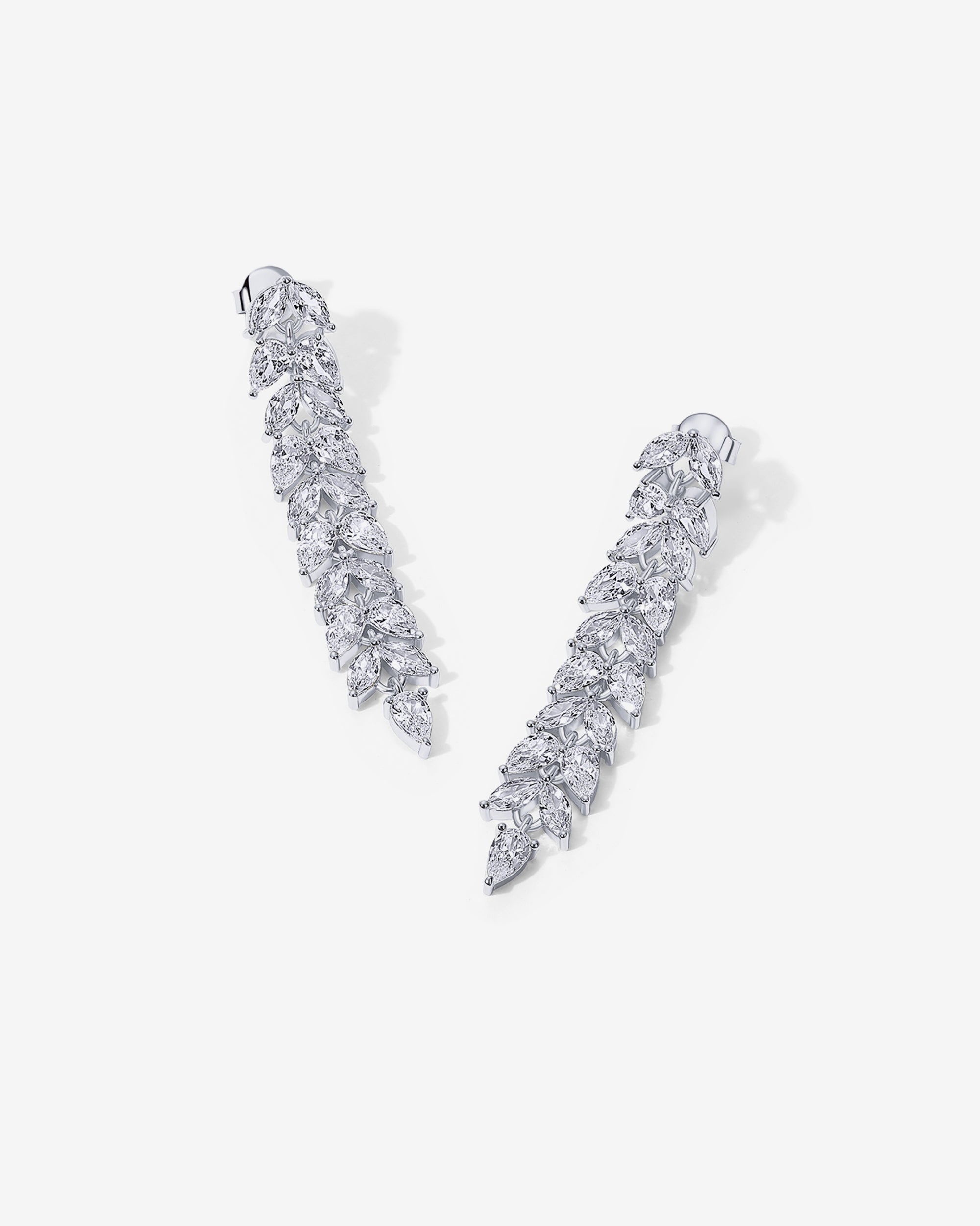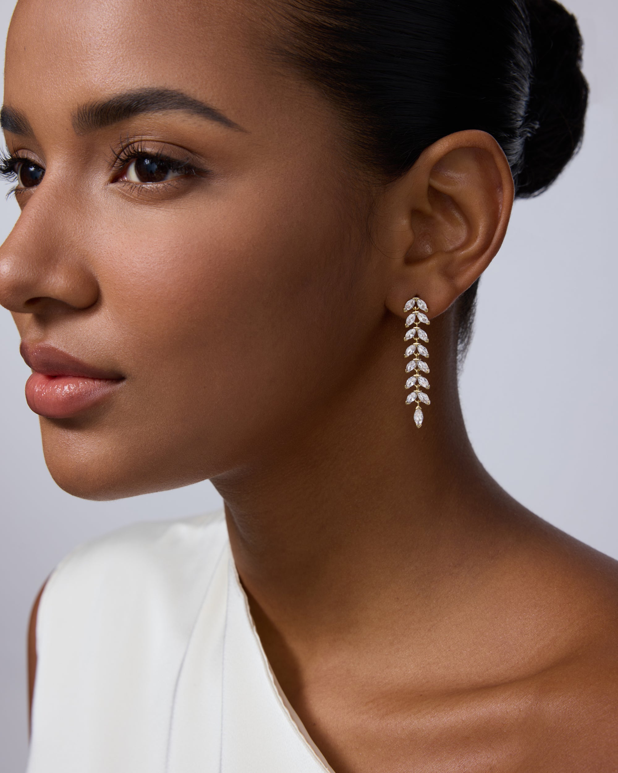Inspired by delicate vines, these teardrop earrings showcase alternating marquise and pear-cut stones along a graceful drop that sparkles with every step. Statement-making yet romantic, these bridal drop earrings are designed to frame your wedding day look with timeless sparkle and unforgettable elegance.