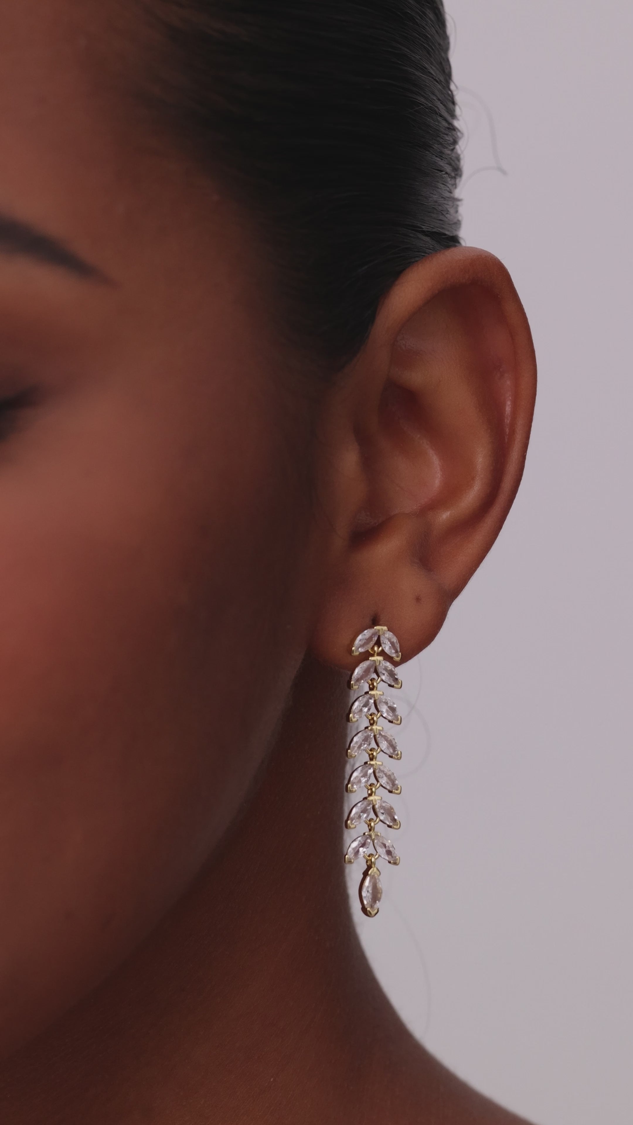 Inspired by delicate vines, these teardrop earrings showcase alternating marquise and pear-cut stones along a graceful drop that sparkles with every step. Statement-making yet romantic, these bridal drop earrings are designed to frame your wedding day look with timeless sparkle and unforgettable elegance. Details: - 14K yellow gold plated or rhodium plated - Measurements: Length: 47mm - Hypoallergenic, cadmium-free, nickel-free and lead-free