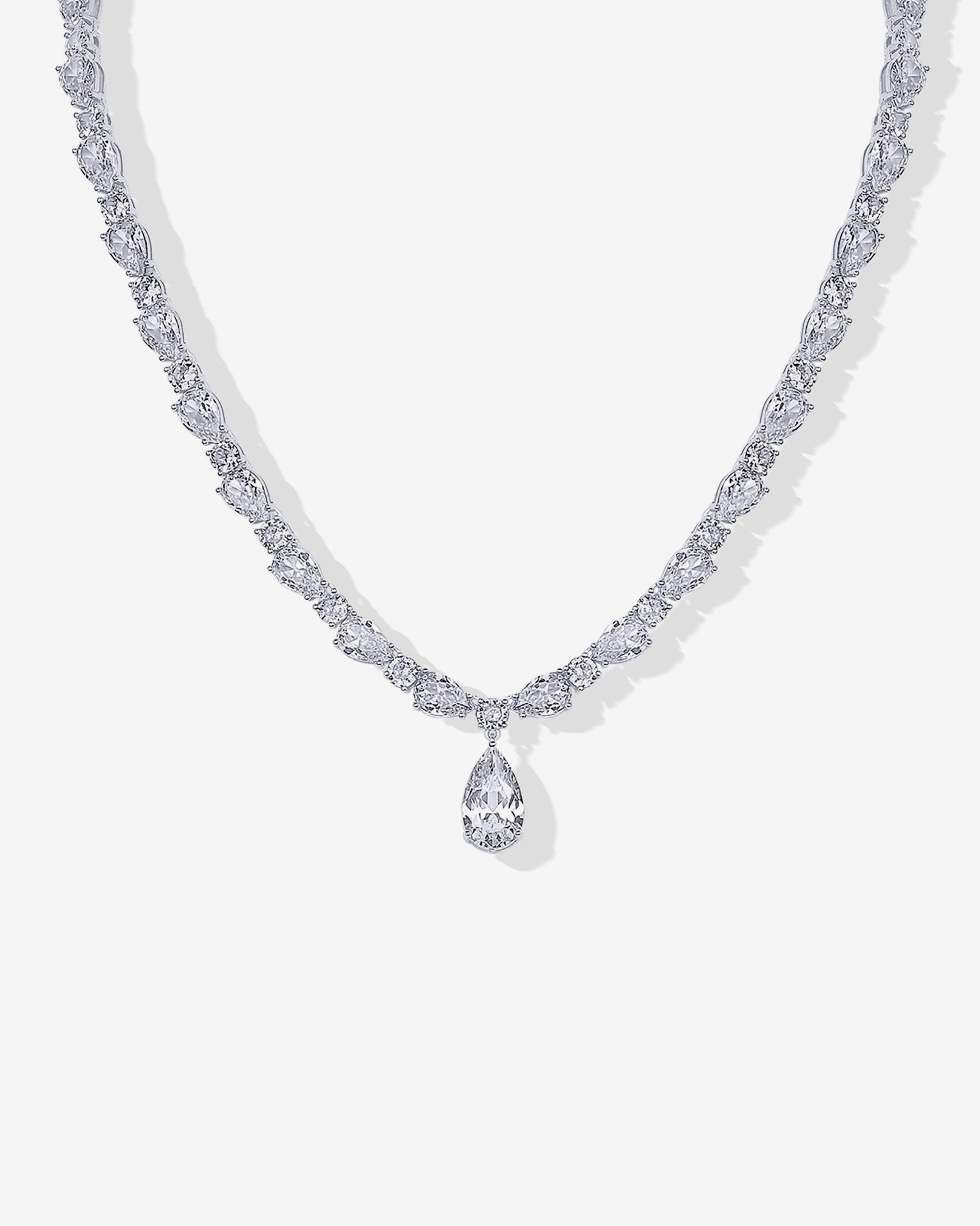 Featuring a dazzling tennis chain with alternating round and pear-shaped stones, this tennis necklace features graceful teardrop pendant for added drama. The elegant design delivers radiant sparkle, making it a stunning choice for bridal wear, while versatile enough to elevate everyday style.