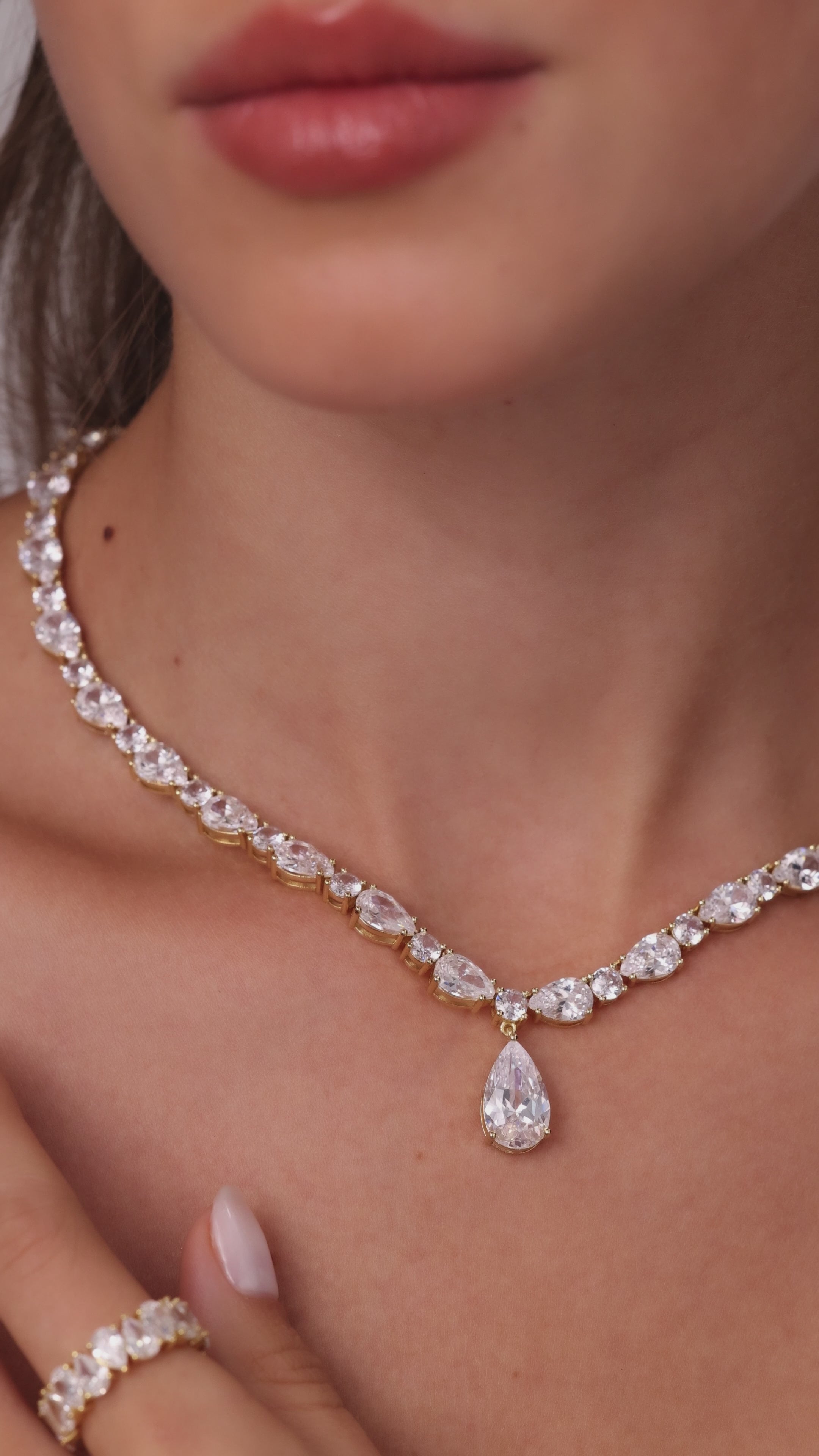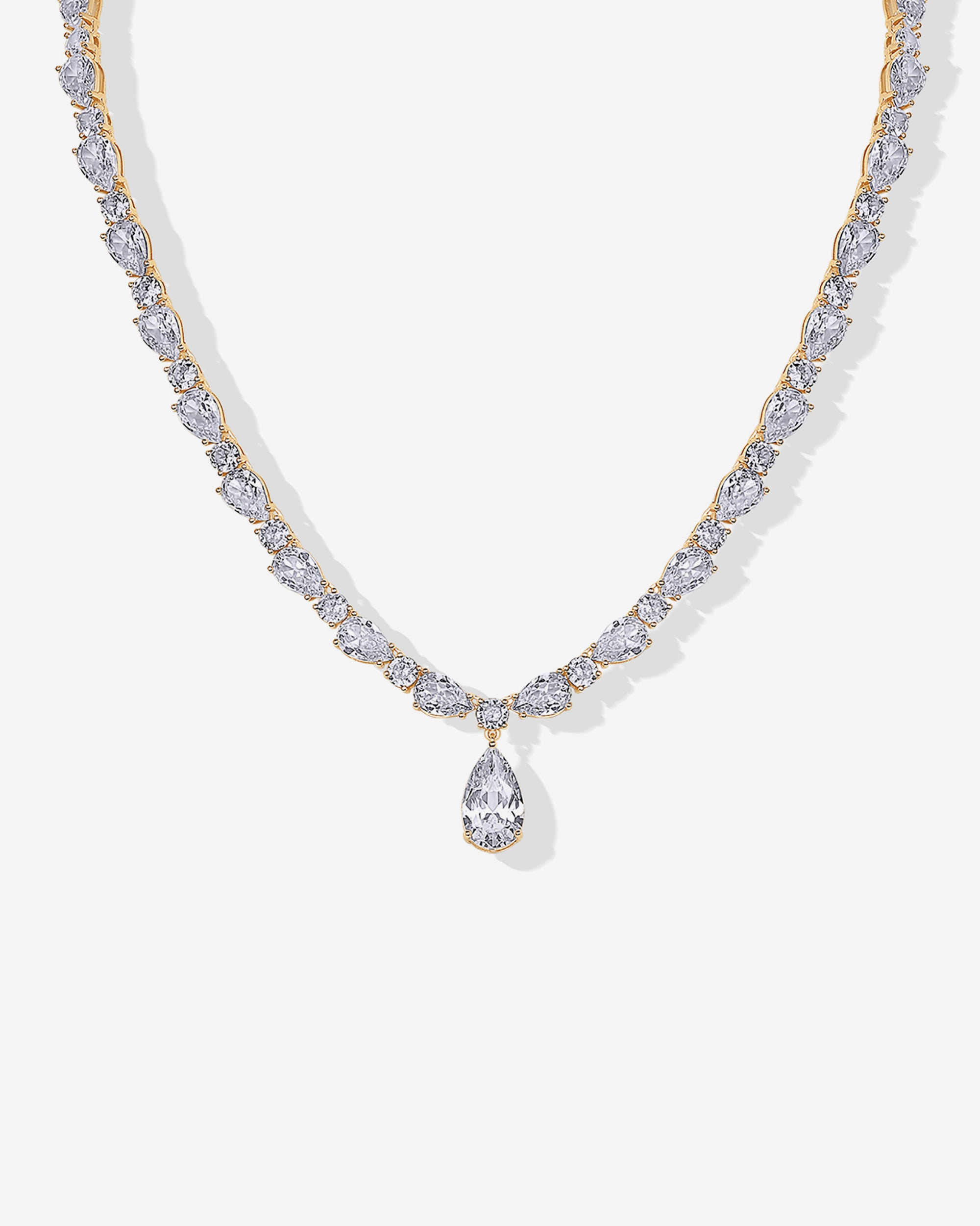Featuring a dazzling tennis chain with alternating round and pear-shaped stones, this tennis necklace features graceful teardrop pendant for added drama. The elegant design delivers radiant sparkle, making it a stunning choice for bridal wear, while versatile enough to elevate everyday style. Details:- 14K yellow gold plated or rhodium plated- Measurements: Length: 16" + 2" extender- Hypoallergenic, cadmium-free, nickel-free and lead-free