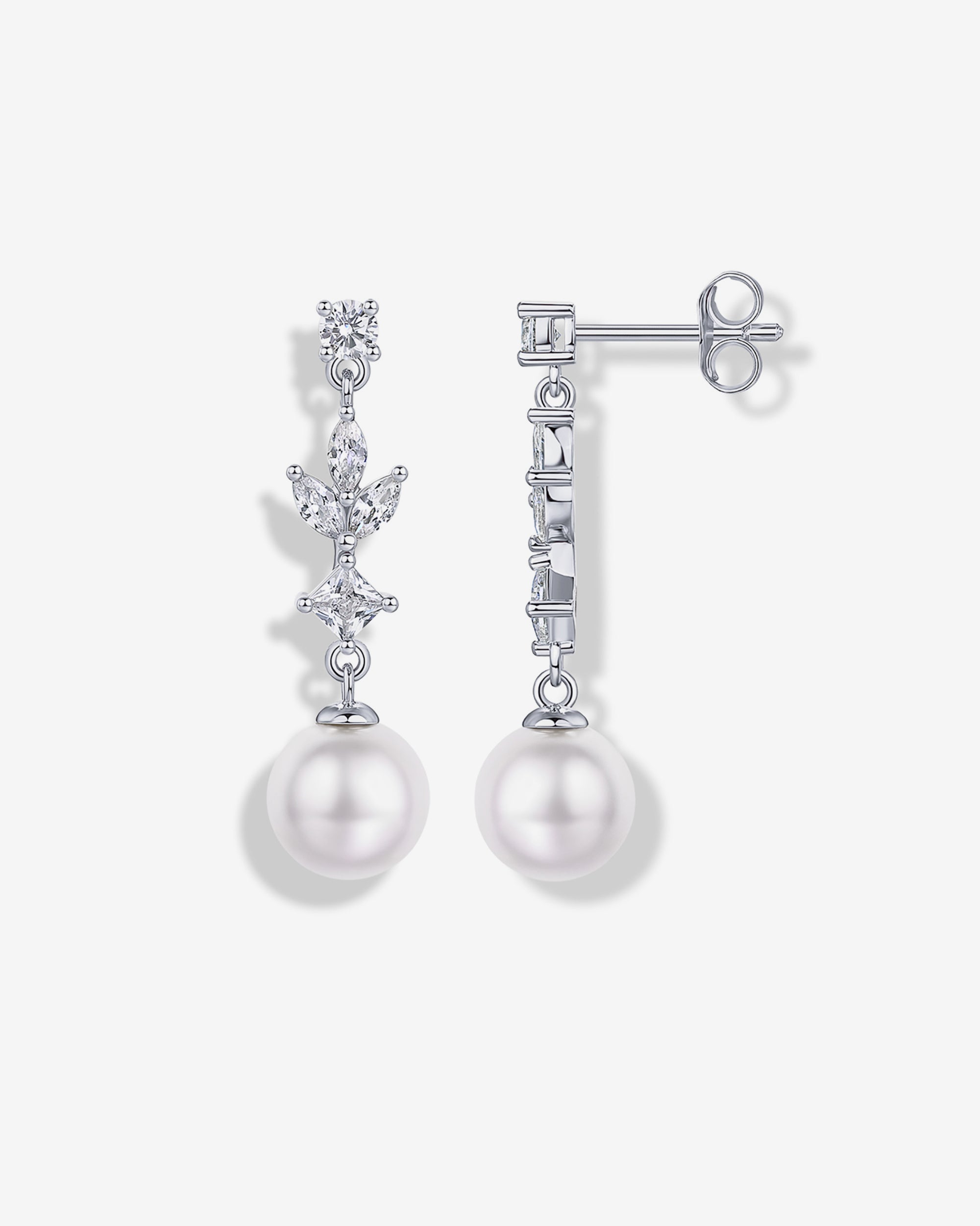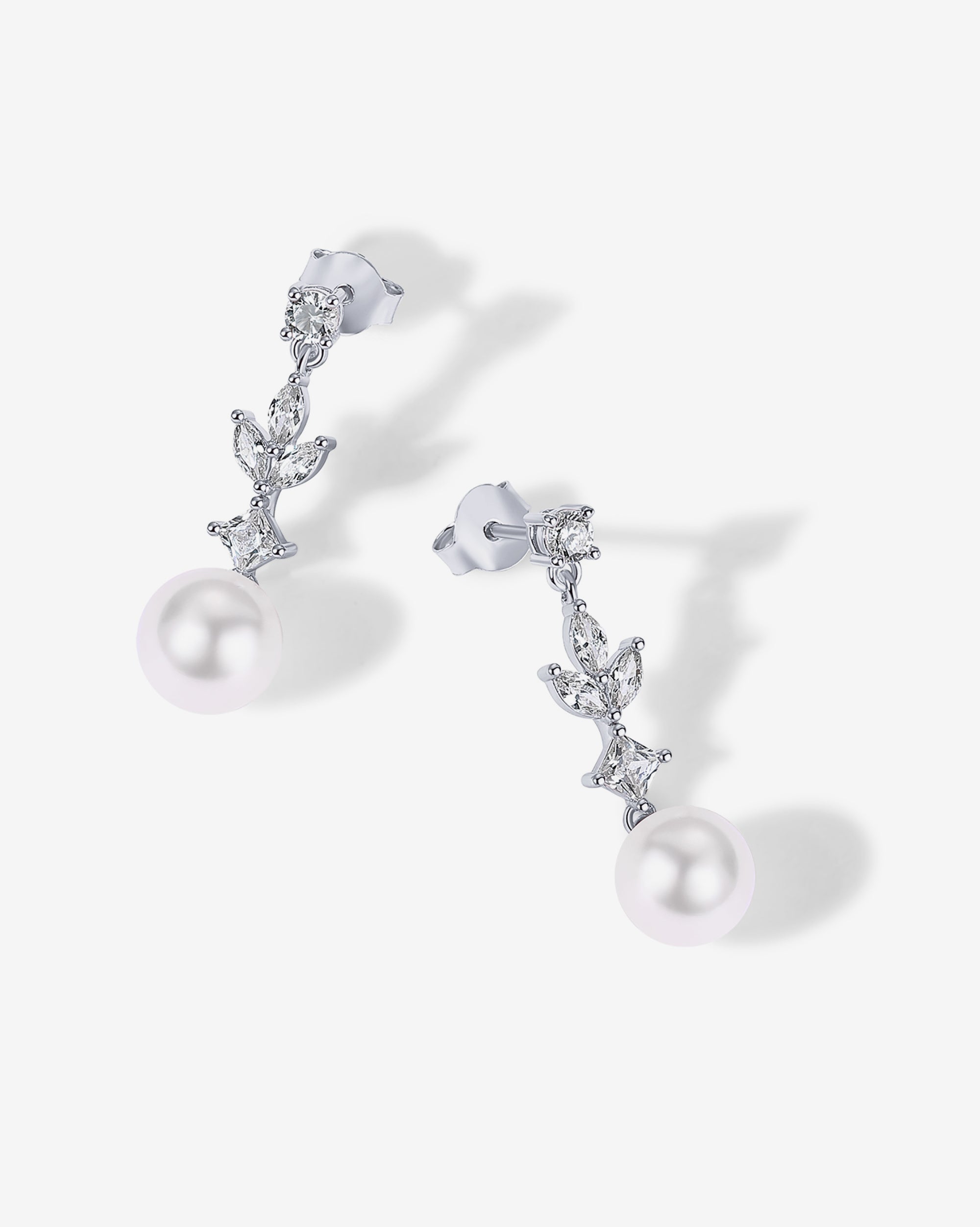 An 8mm mother of pearl takes center stage, suspended from a linear cascade of round, marquise, and square-cut simulated diamond stones in a refined drop. Radiant and unforgettable, these bridal drop earrings are designed to glow with timeless elegance on your wedding day.