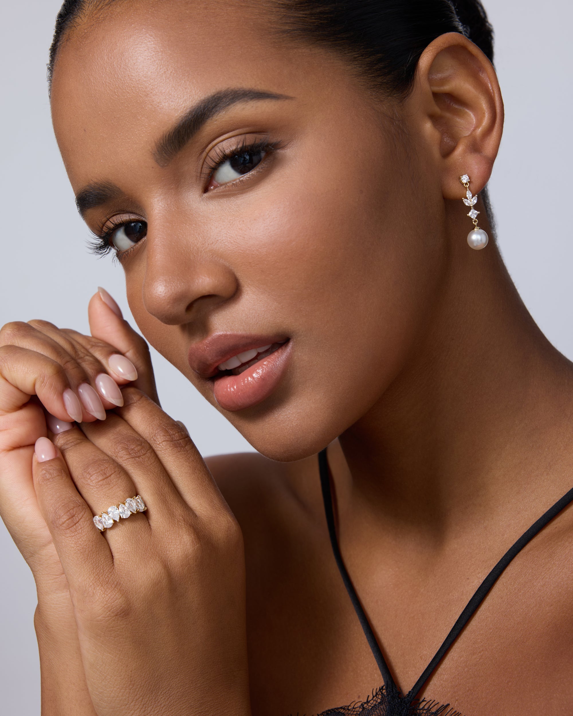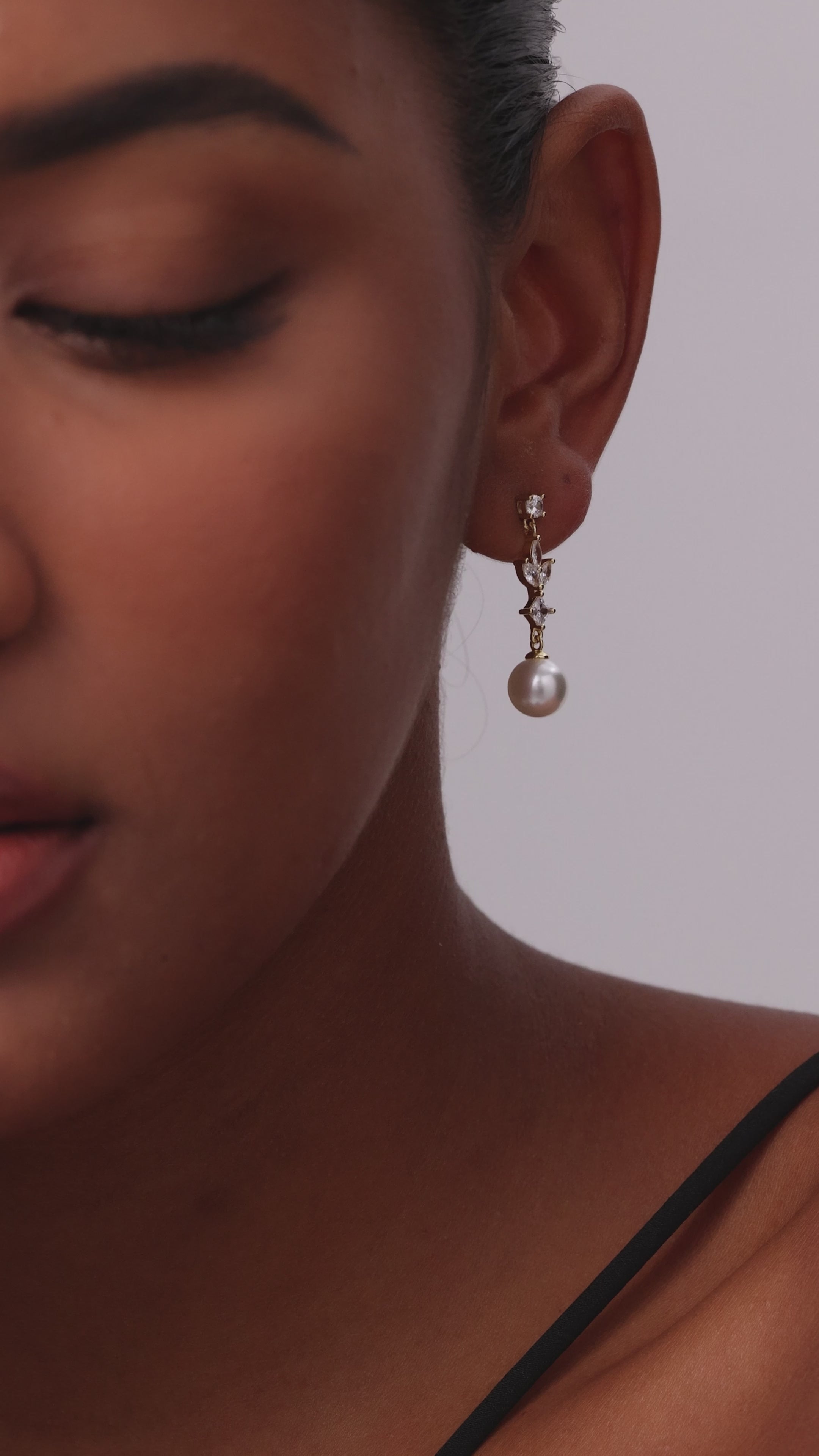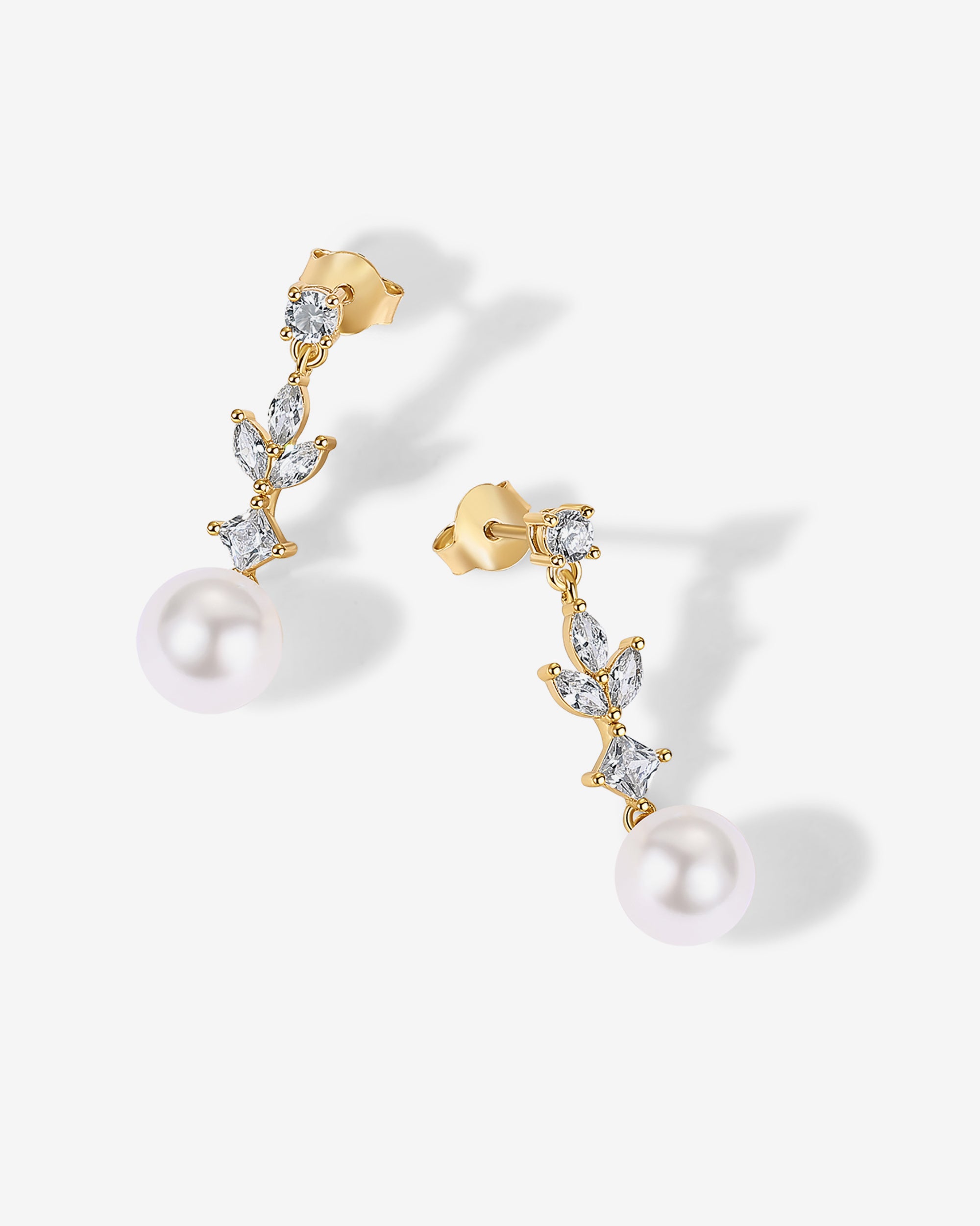 An 8mm mother of pearl takes center stage, suspended from a linear cascade of round, marquise, and square-cut simulated diamond stones in a refined drop. Radiant and unforgettable, these bridal drop earrings are designed to glow with timeless elegance on your wedding day. Details: - 14K yellow gold plated or rhodium plated - Measurements: Length: 19mm - Hypoallergenic, cadmium-free, nickel-free and lead-free
