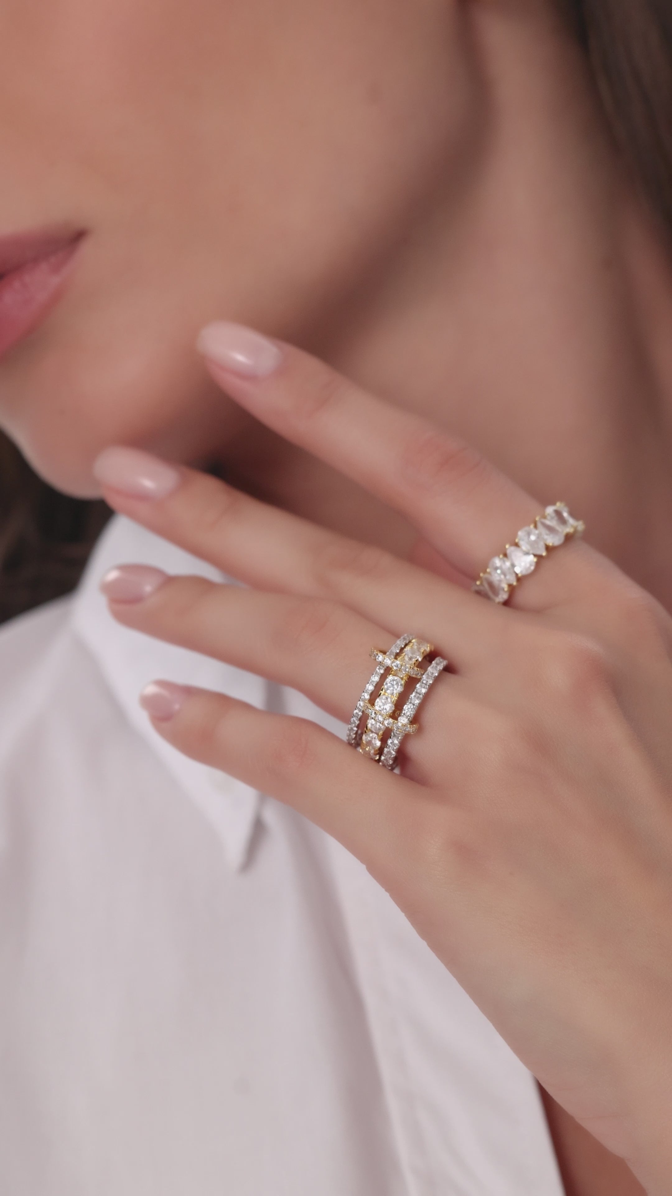 Three bands, one stunning statement. This 14K gold plated two-tone interlocked ring features sparkling AAAAA cubic zirconia for a touch of elegance. Perfect for stacking, layering, or wearing solo as a statement ring, it is designed to make your fingers look long, slender, and completely on-trend. Crafted with precision, the ring measures 5mm (0.20") in width and 1.5mm (0.06") in thickness. Hypoallergenic and free from nickel, lead, and cadmium, it meets strict U.S. and EU safety standards, offering both stylish and worry-free everyday wear.