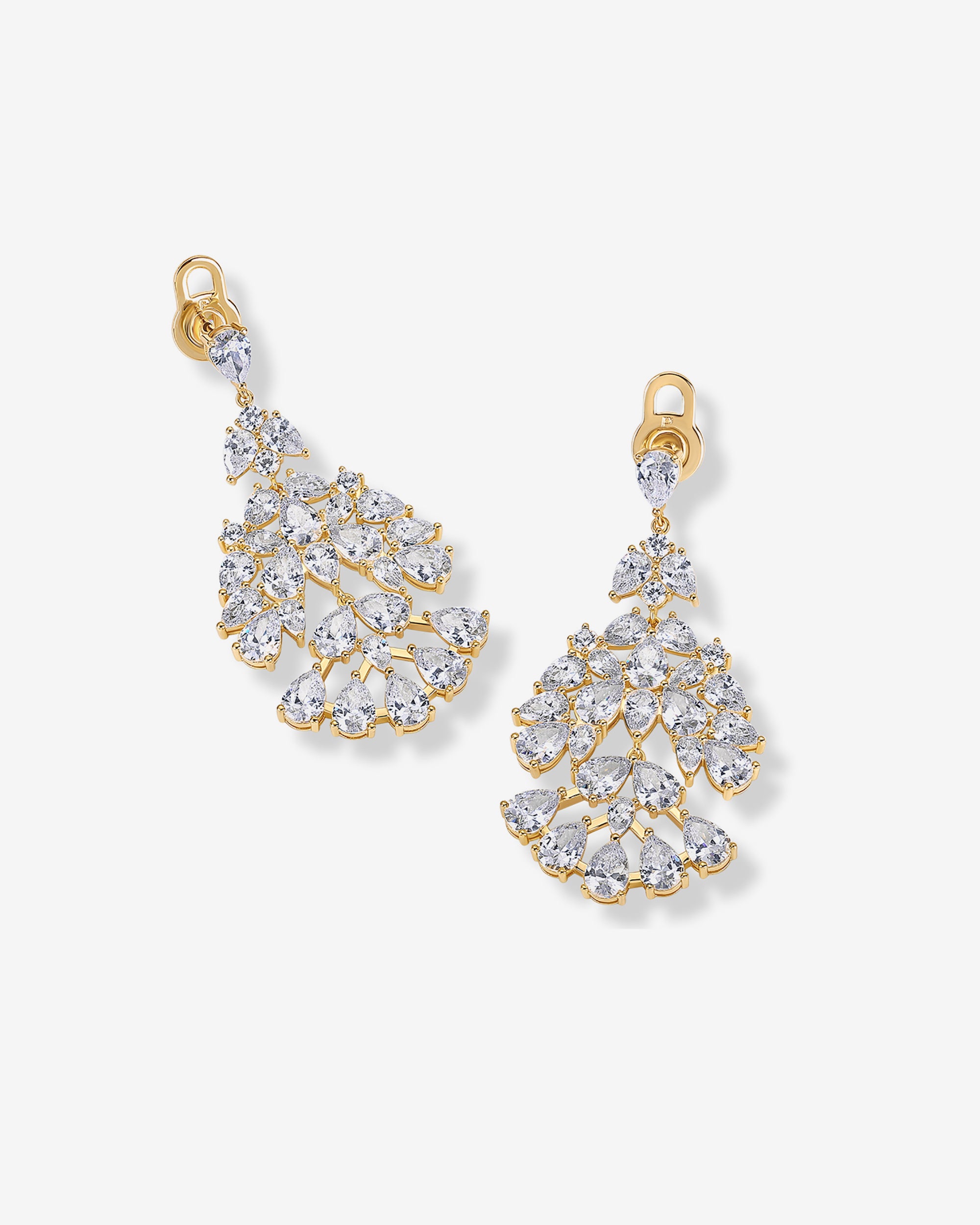 A breathtaking cascade of pear-cut stones creates a bold crystal chandelier style. Designed as statement bridal drop earrings, they deliver radiant sparkle and show-stopping elegance to make your wedding day unforgettable. Details: - 14K yellow gold plated or rhodium plated - Measurements: 58mm x 30mm - Hypoallergenic, cadmium-free, nickel-free and lead-free