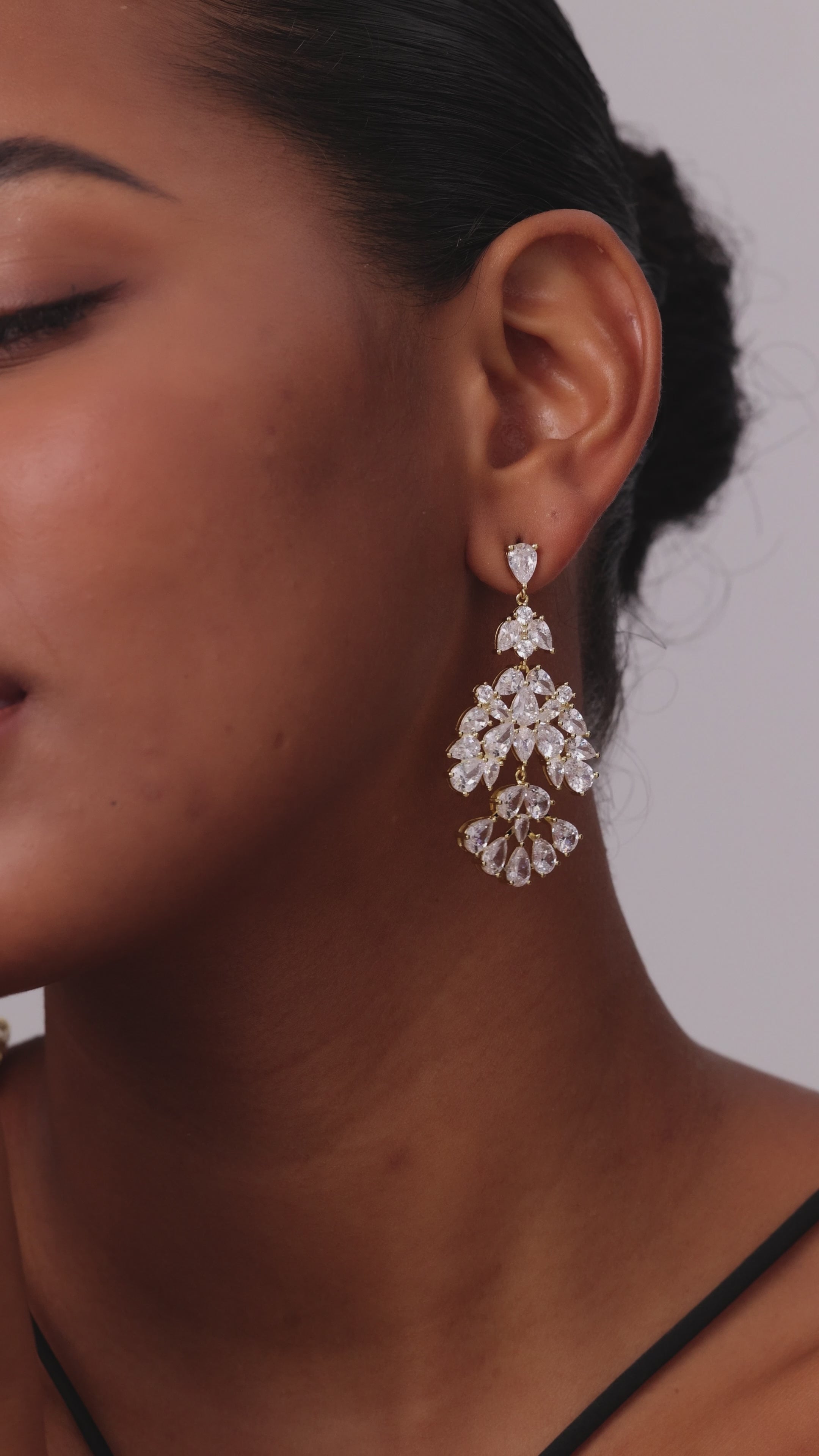 A breathtaking cascade of pear-cut stones creates a bold crystal chandelier style. Designed as statement bridal drop earrings, they deliver radiant sparkle and show-stopping elegance to make your wedding day unforgettable.