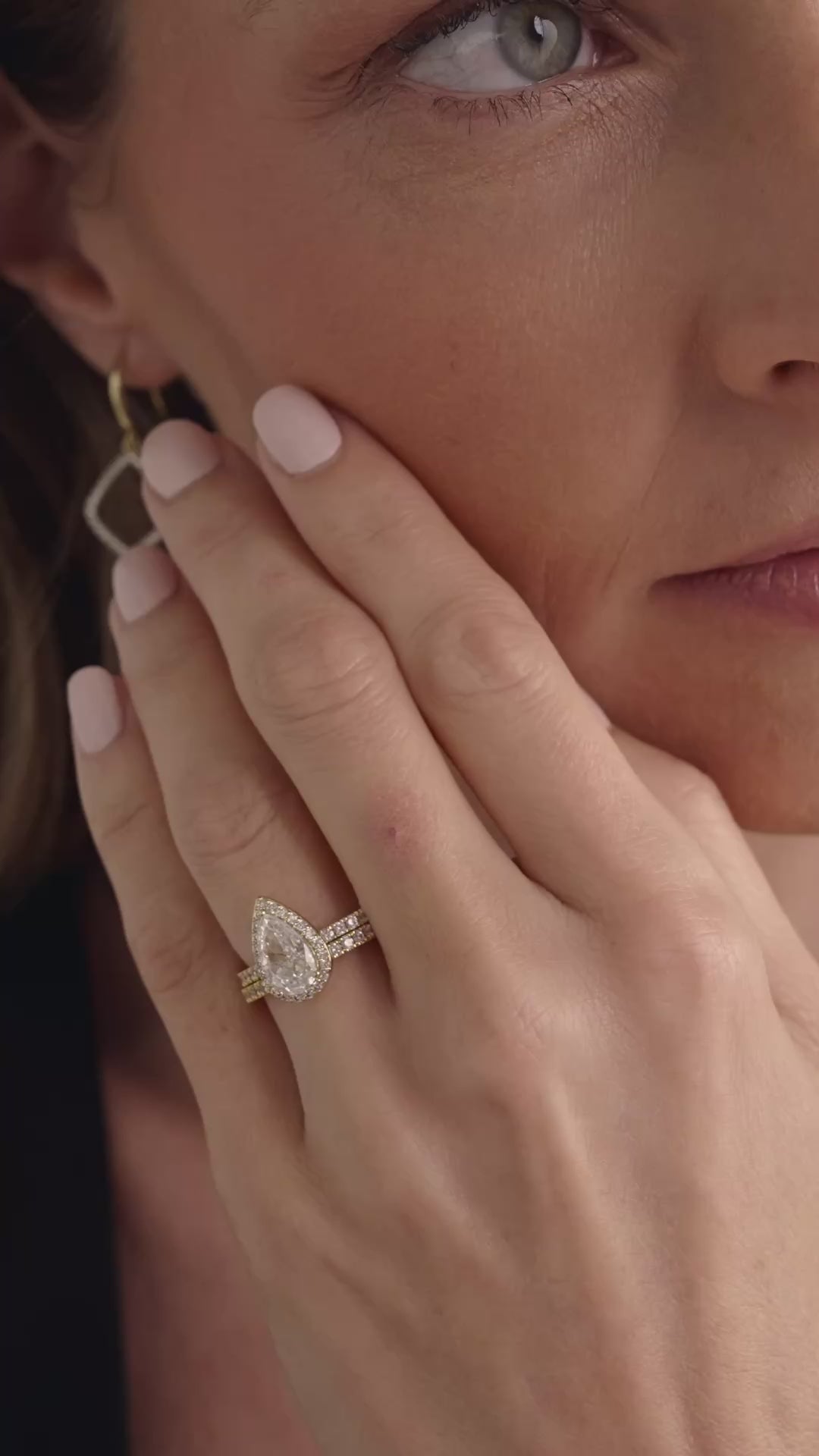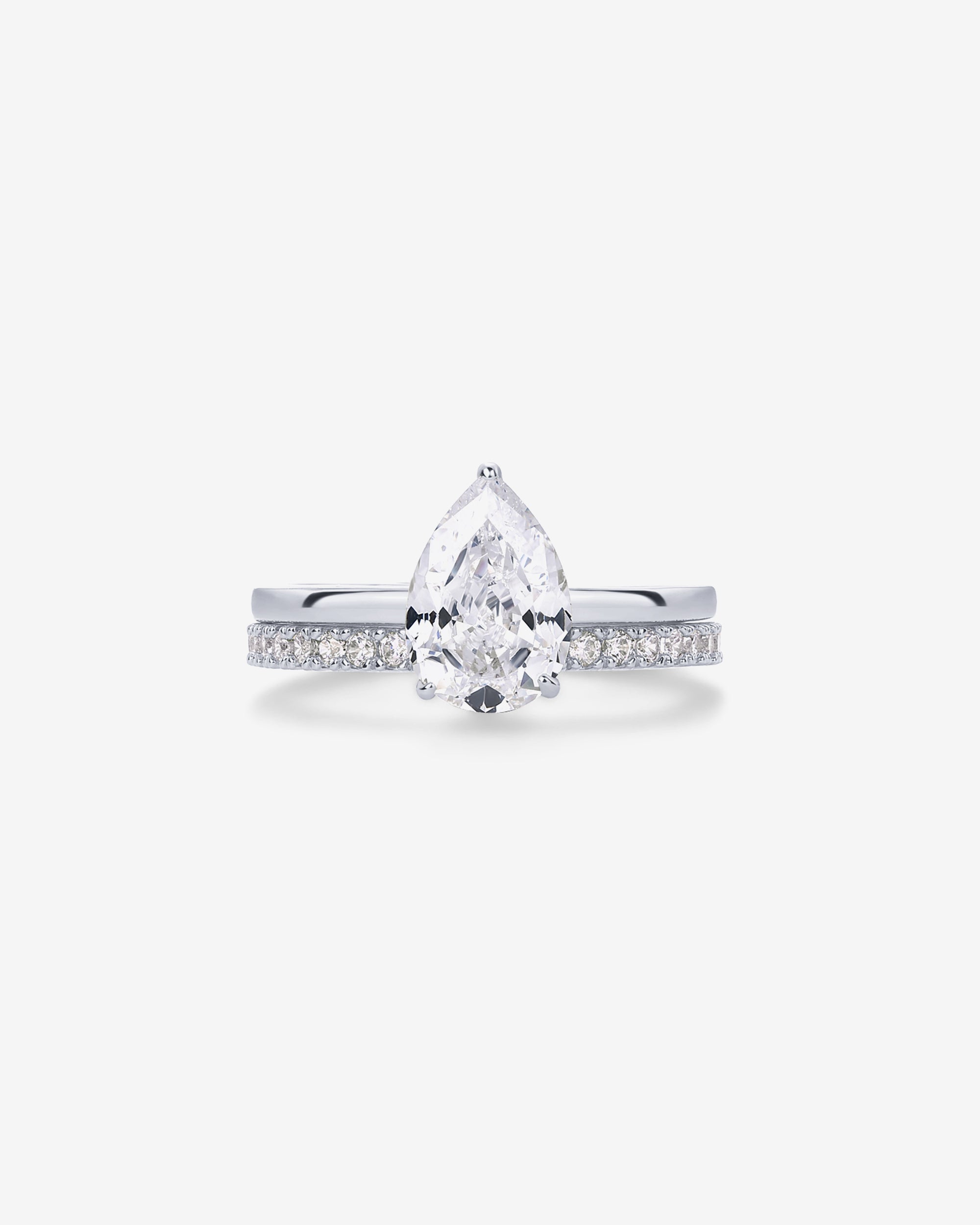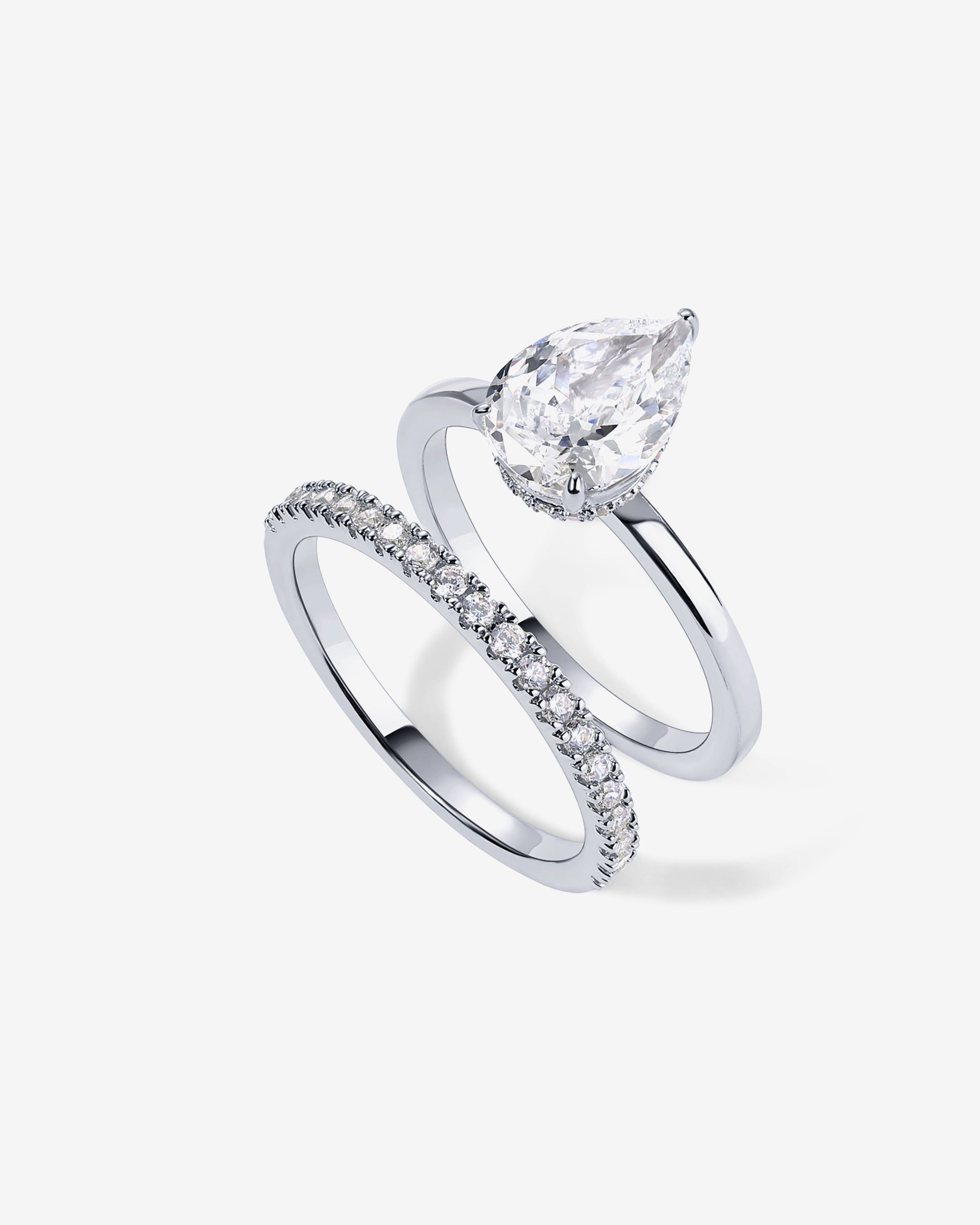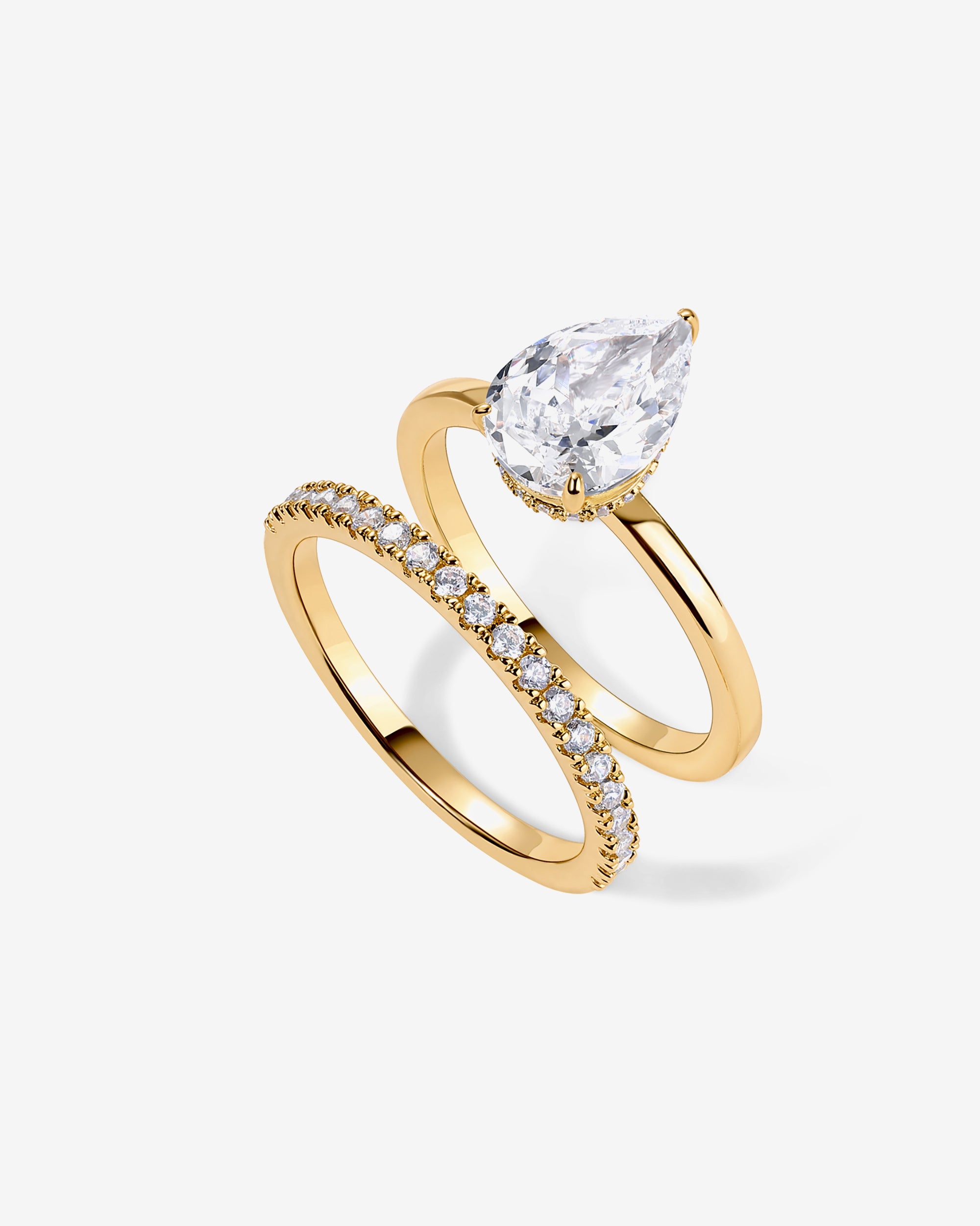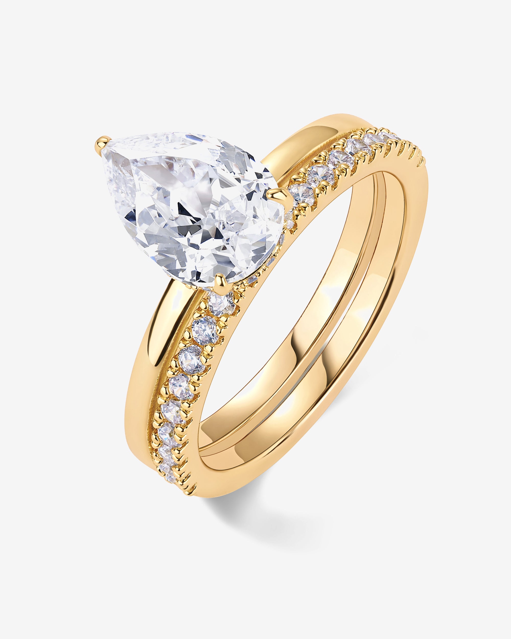 Shine bright like a diamond... but better — this engagement-style ring set features blingy cubic zirconia-lined bands, 14K gold plating, and a standout pear-shaped cubic zirconia center stone. Plus, it's sensitive-skin safe and made without nickel, cadmium, or lead.