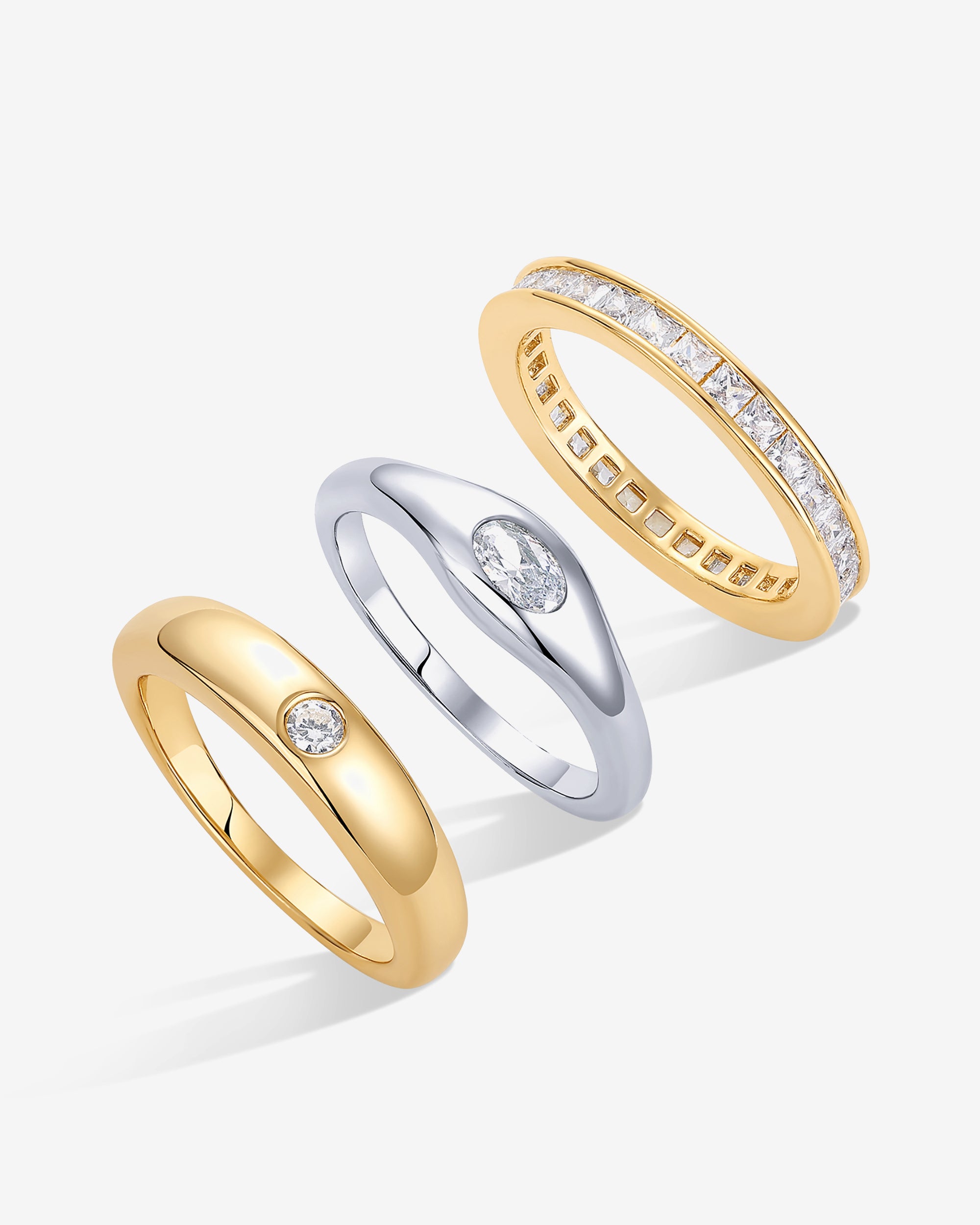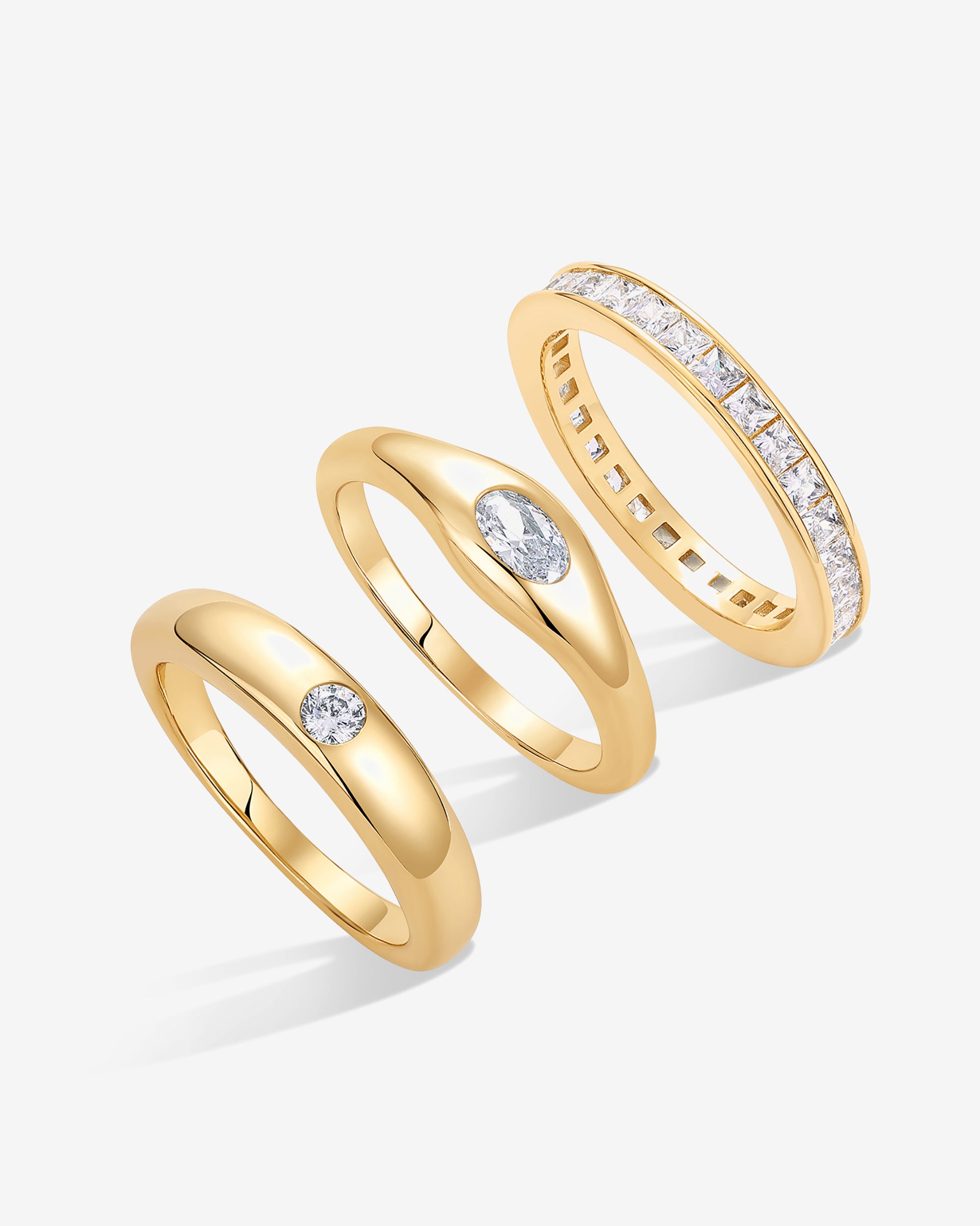 Elegant 14K gold plated stackable ring set with three bands (6mm, 3mm, 4.5mm) featuring round, oval, and square cubic zirconia. Perfect for stacking, mixing, or wearing individually for a stylish, everyday look.