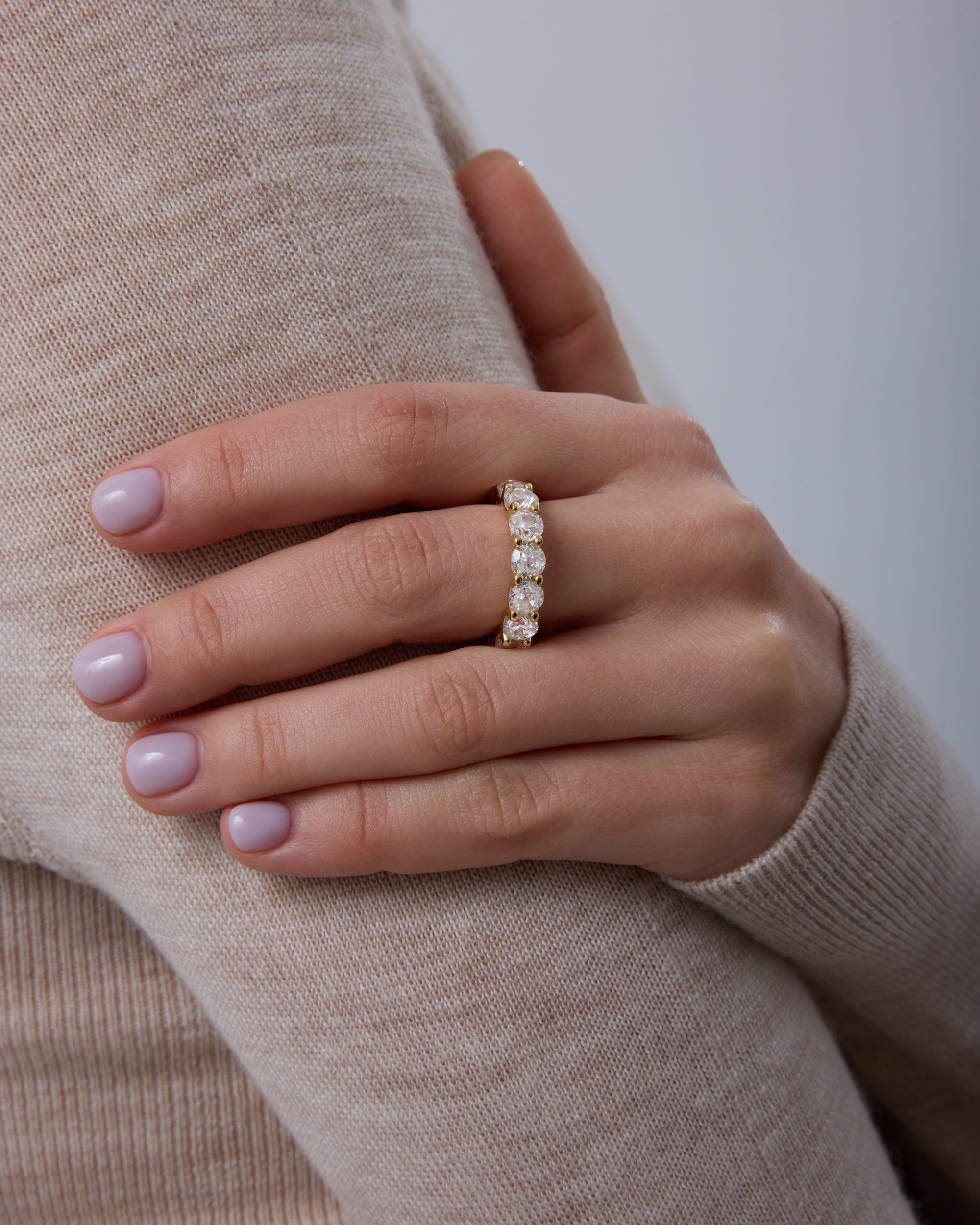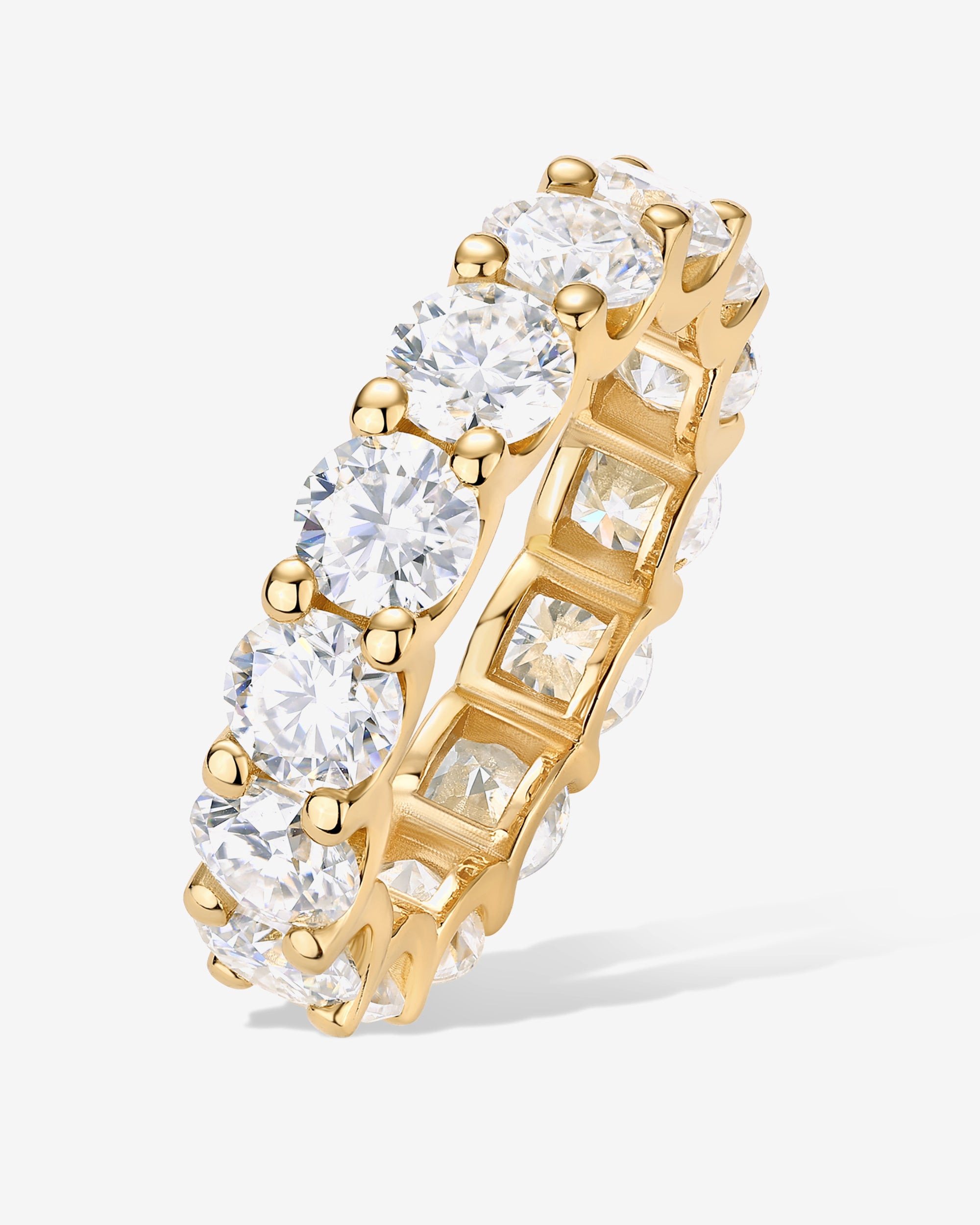 Elegant 14K gold plated eternity ring with a 5mm band and sparkling round cubic zirconia. Perfect for weddings, stacking, or wearing alone for a timeless, everyday sparkle.