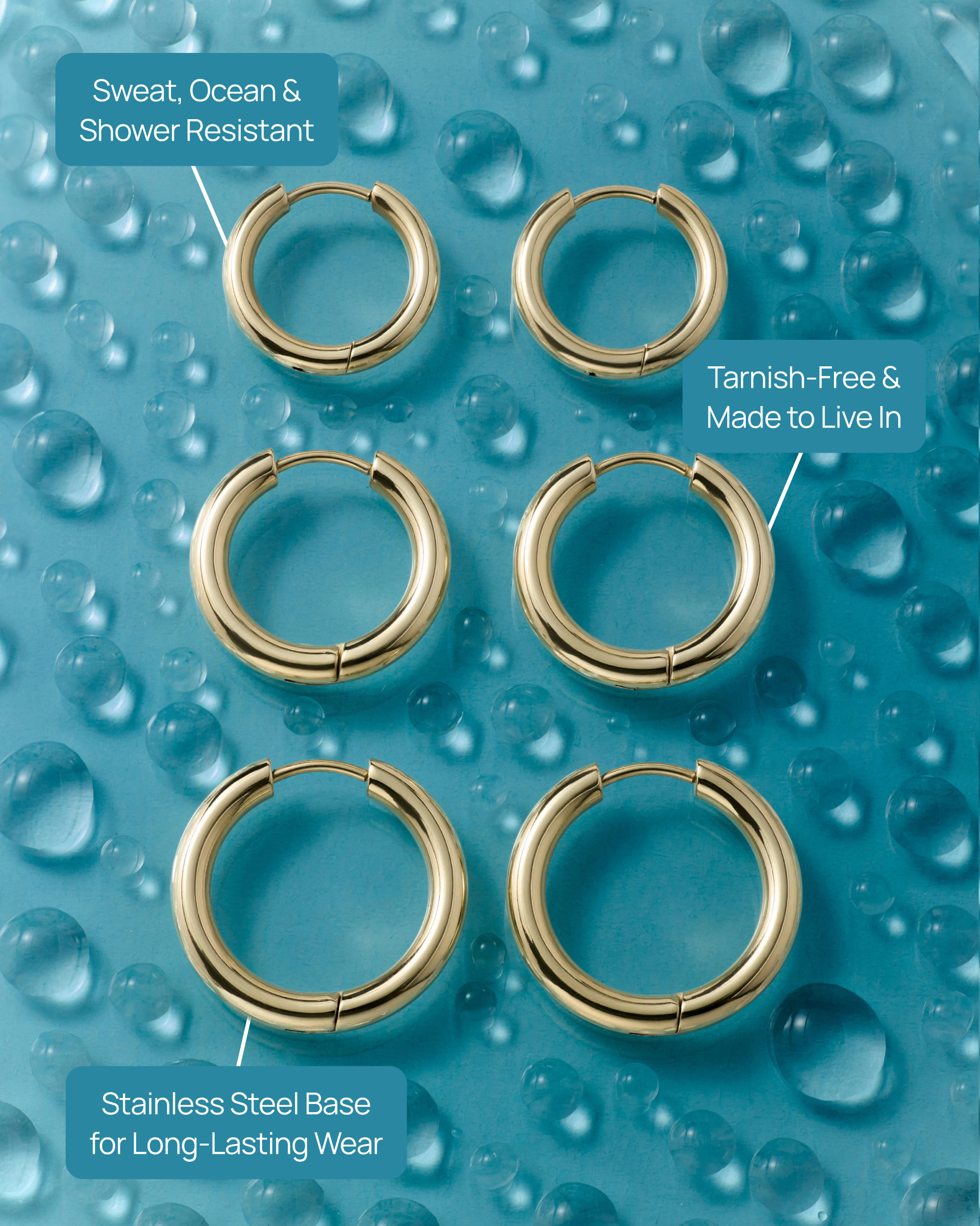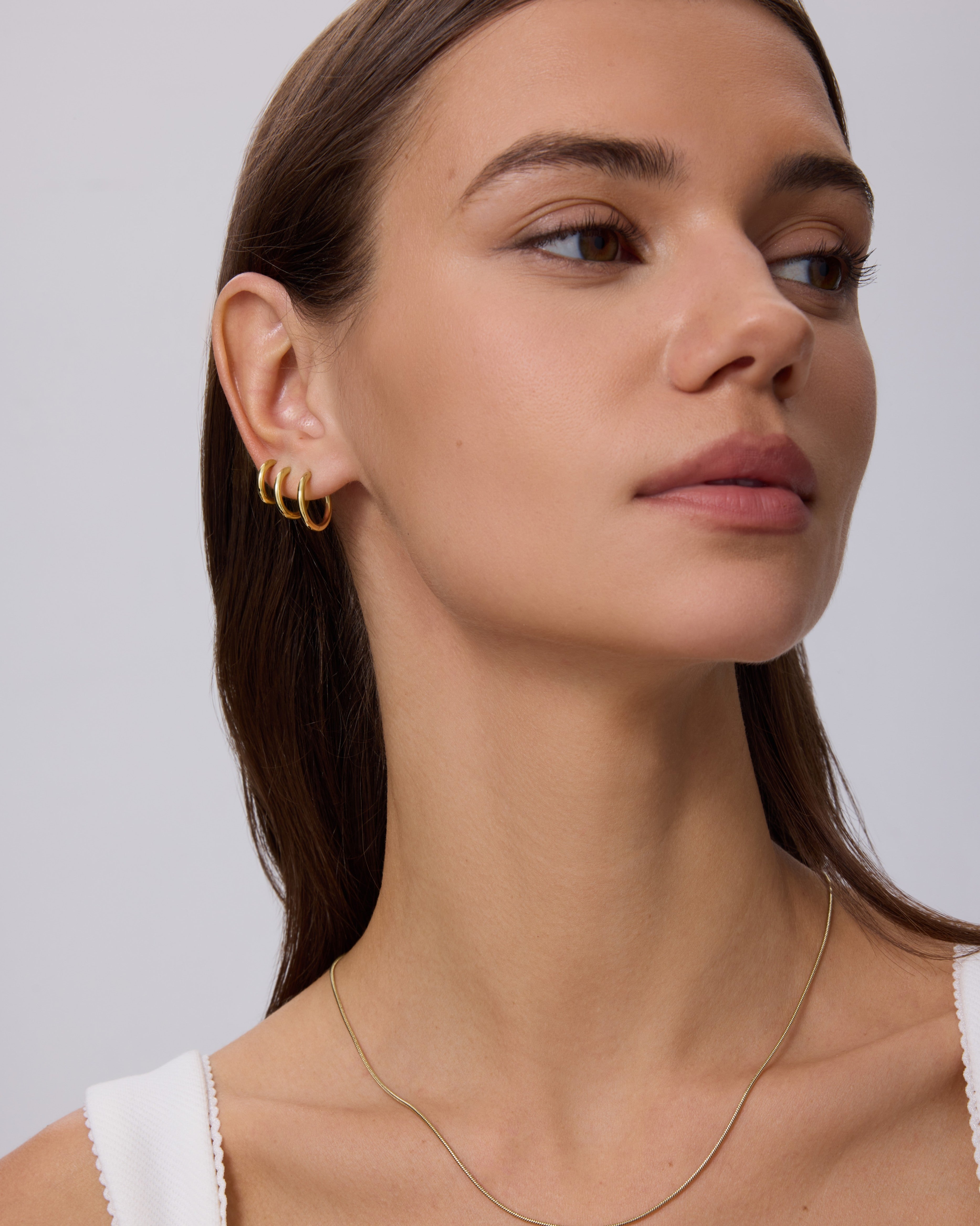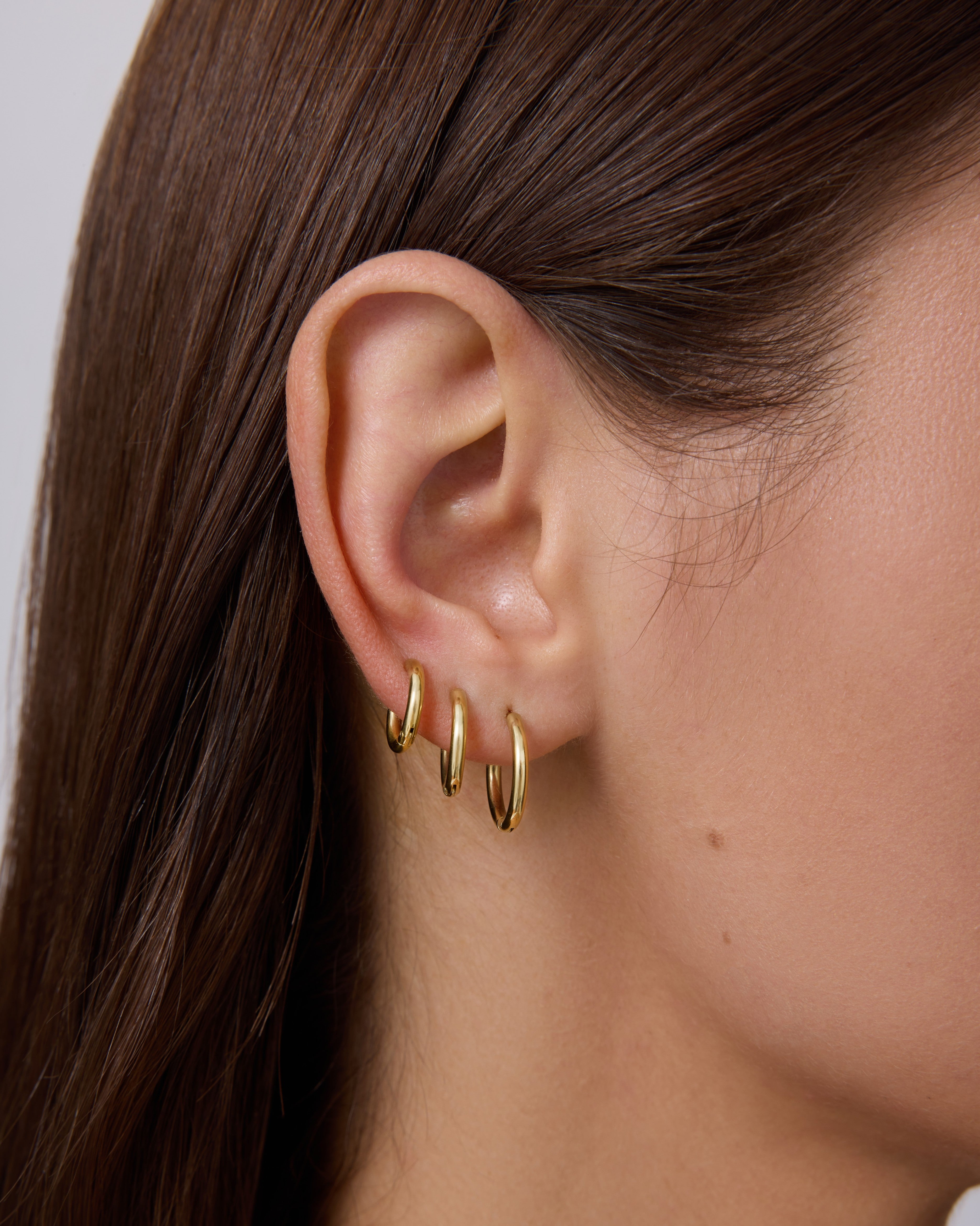 A versatile set of 12mm, 14mm, and 16mm waterproof gold hoops designed for effortless stacking and everyday elegance. Lightweight and comfortable with secure hinge backs.